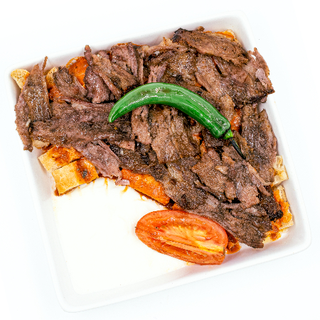 Pan de la casa, döner kebab (autentico) de res, salsa sofra de jitomate, salsa mantequilla, chile asado, yogurt natural sin azúcar. importante: te aconsejamos comer el iskender a la manera turca para que obtengas el sabor real, de un solo bocado mezcla la carne el pan y añade el yogurt así la explosión de sabor será la correcta! disfrútalo.