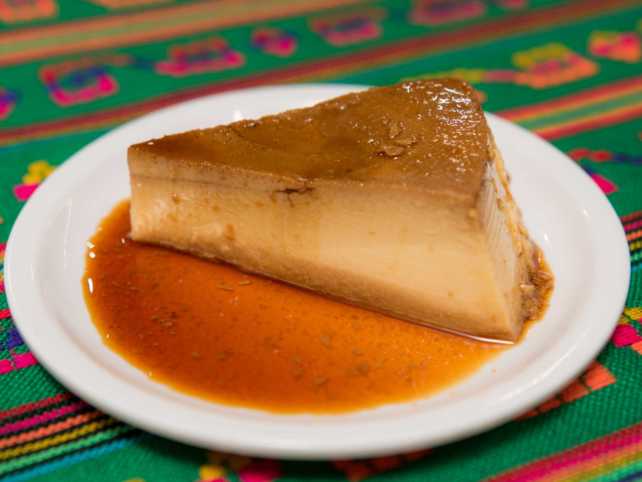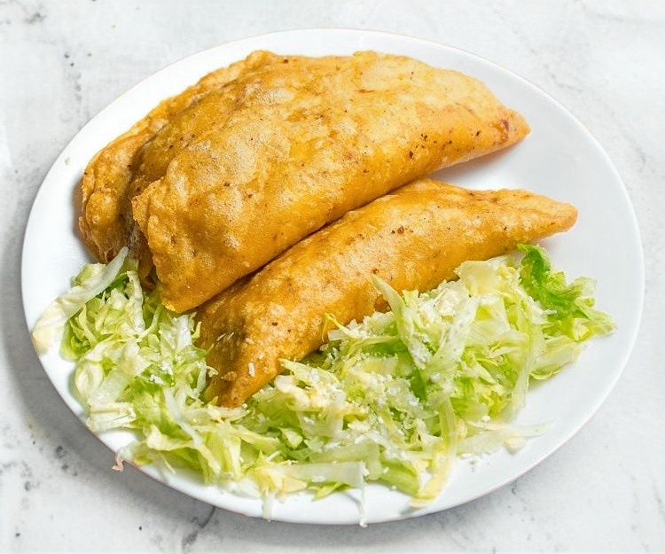 Bolillo bañado con la salsa tradicional picante relleno de papa y rajas poblanas acompañado de romanita, queso sopero y crema.