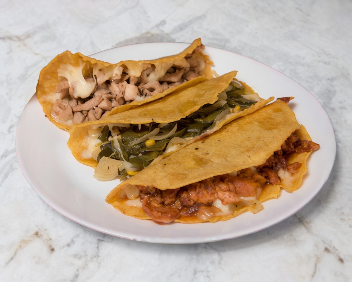 Orden de tres tacos de tortilla de maiz con pollo y queso.