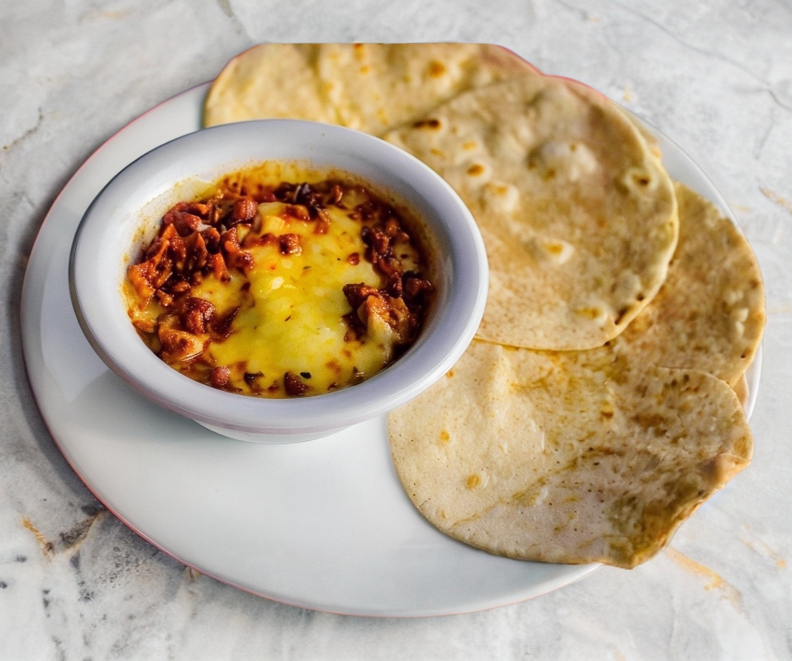 Queso fundido con chorizo (Incluye tortillas de harina 4pzs).