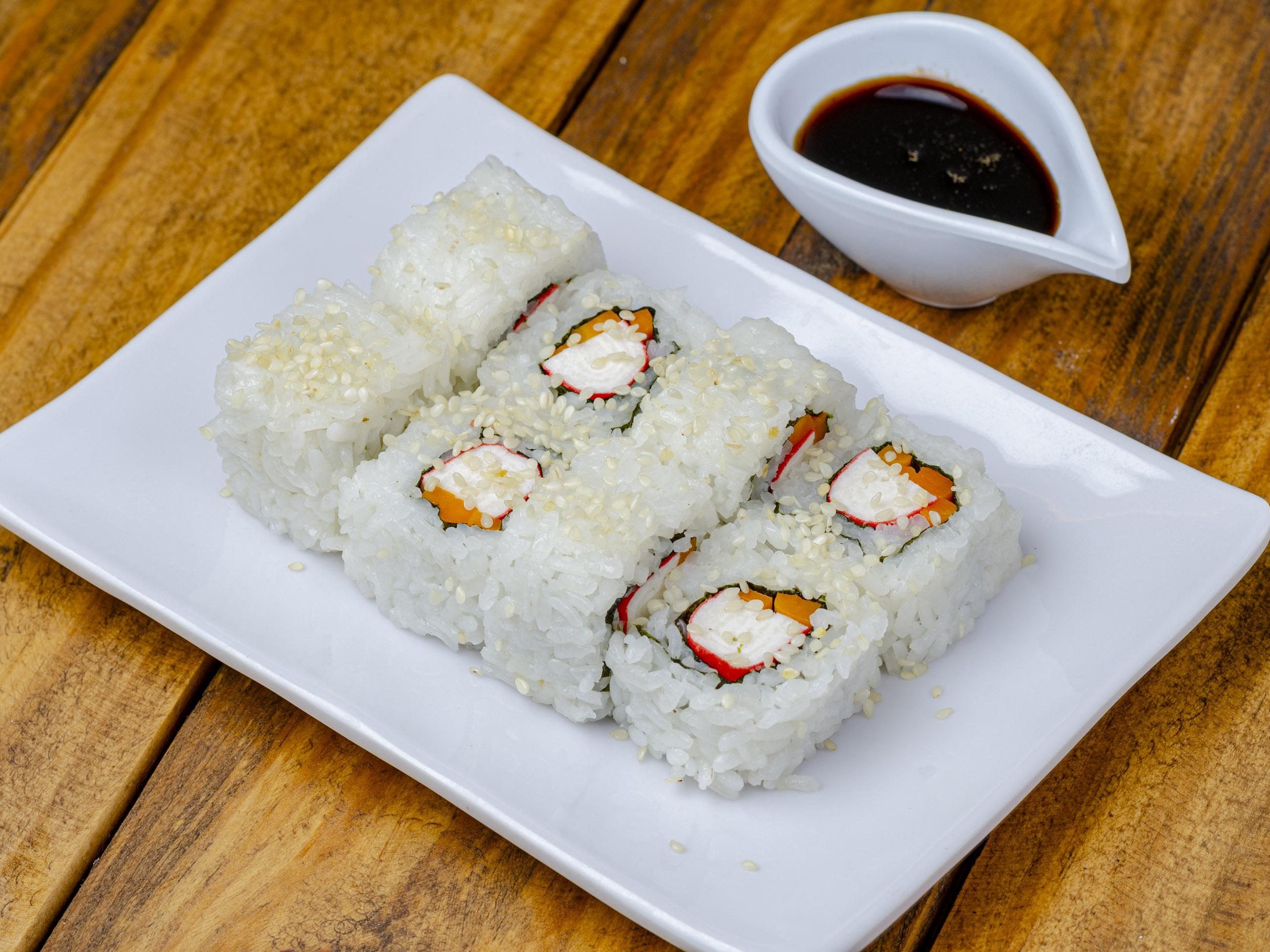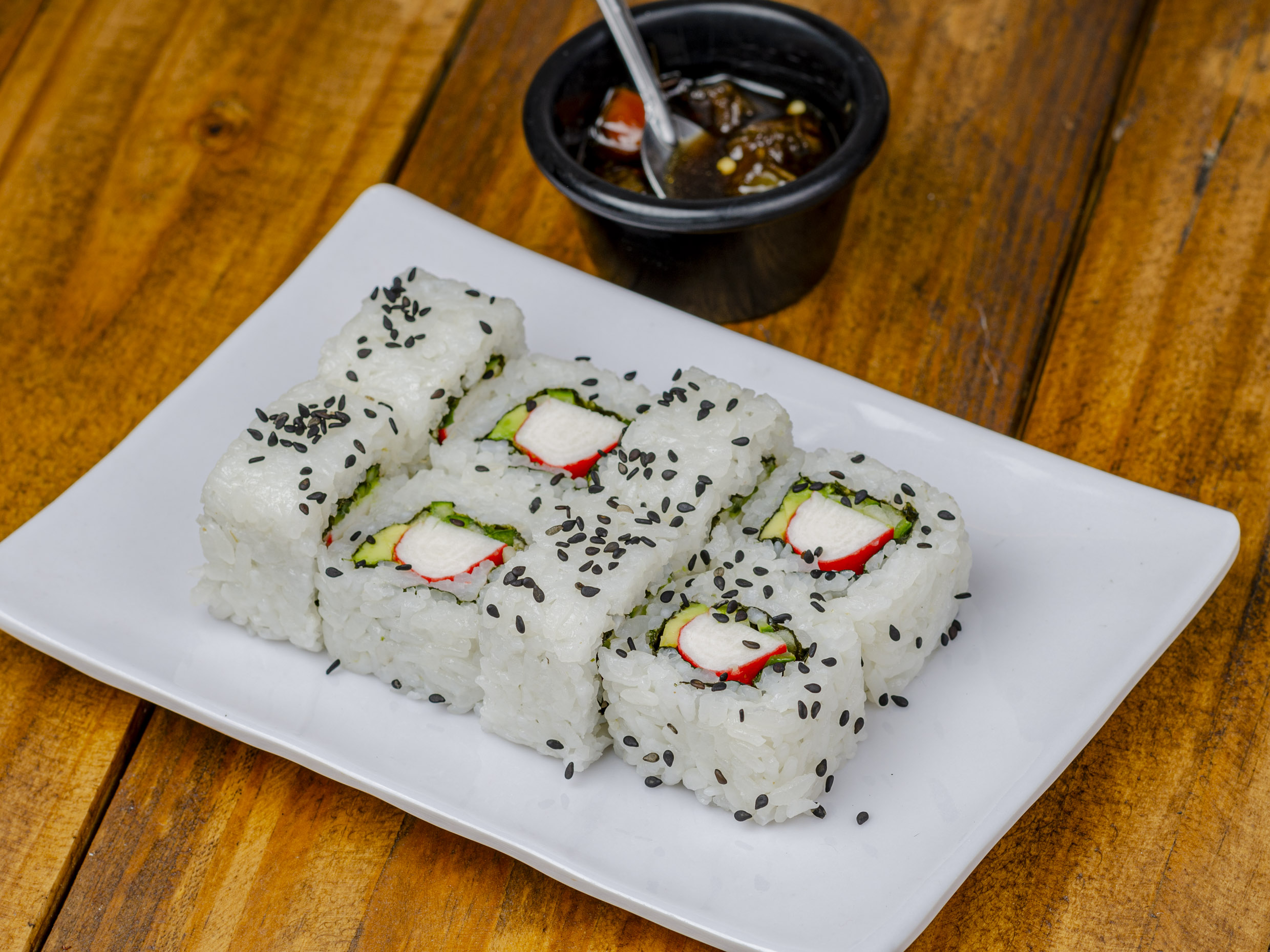 Elaborado con surimi en tempura, pepino fresco y aguacate. Cubierto con ajonjolí negro tostado.