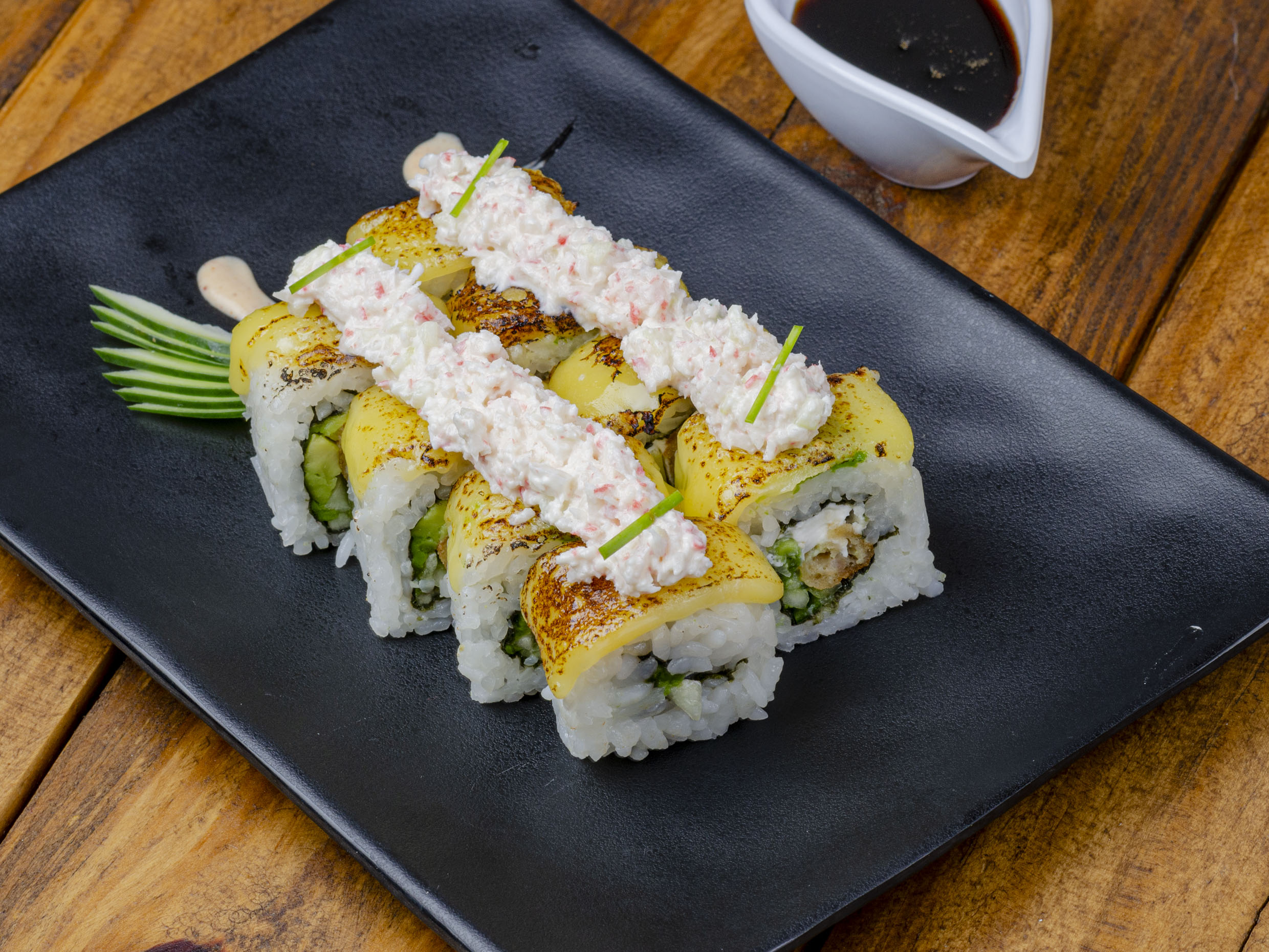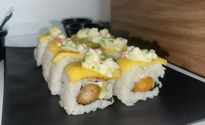 Relleno de camarón empanizado, pepino, aguacate y Philadelphia, gratinado con queso y cubierto con una capa de tampico fresco.