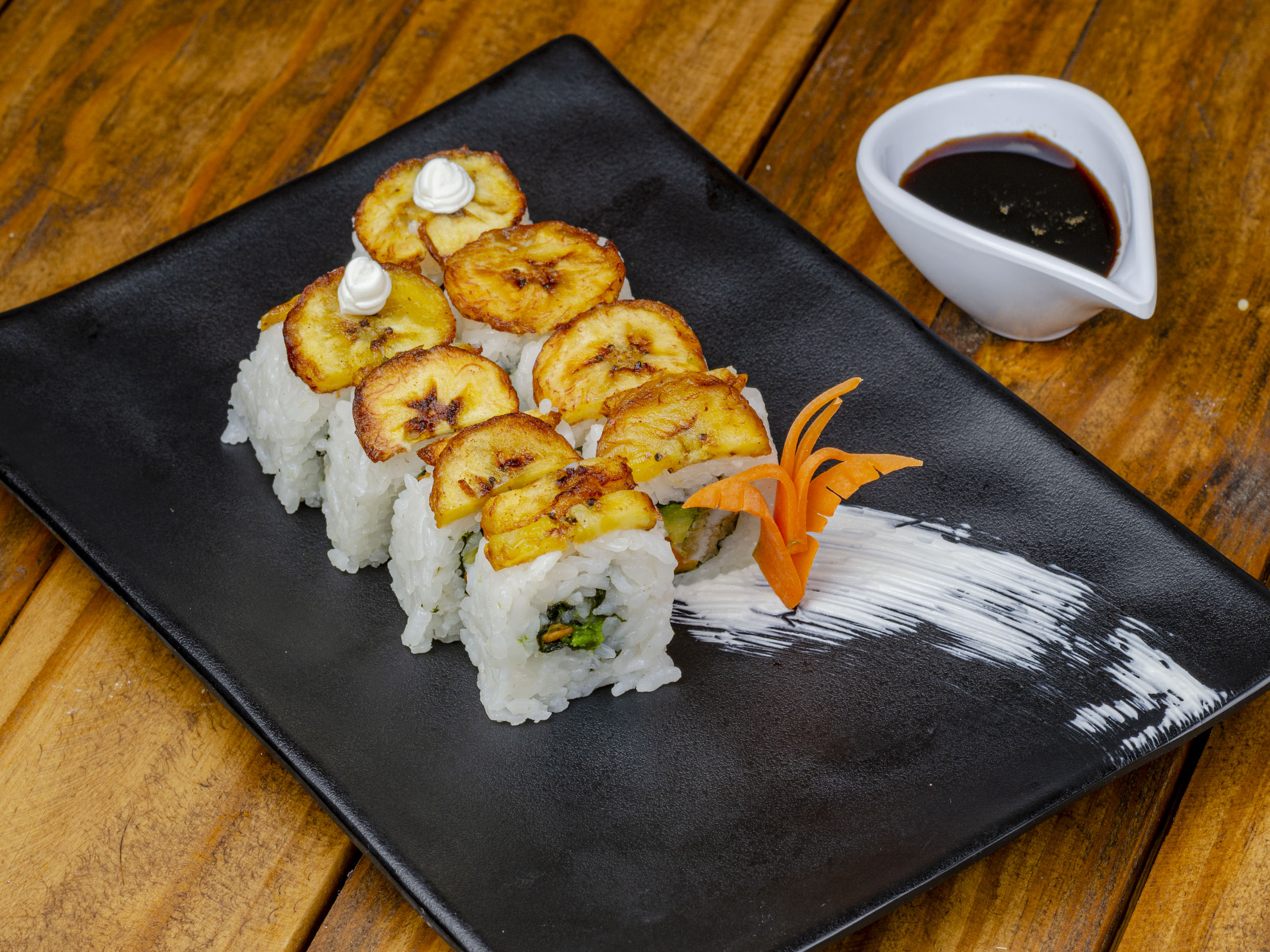 Rollo relleno de surimi, pepino, aguacate y Philadelphia, cubierto con láminas de platano frito y terminado con una salsa spicy anguila