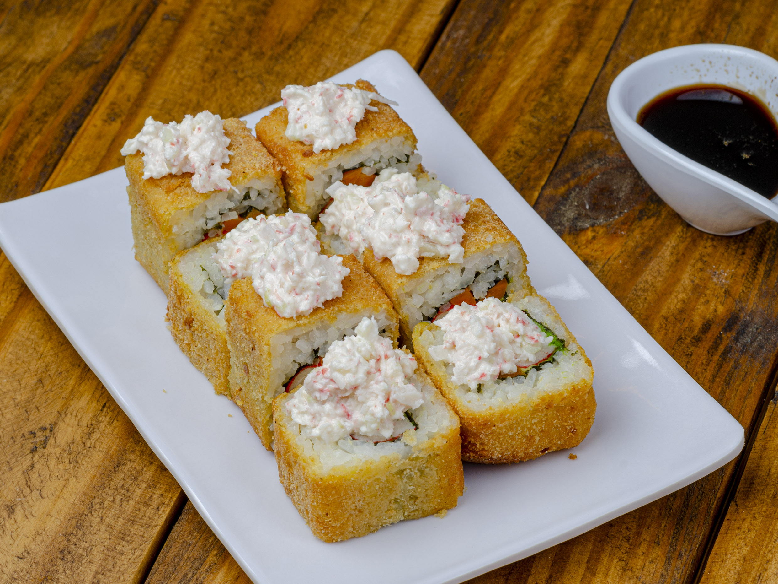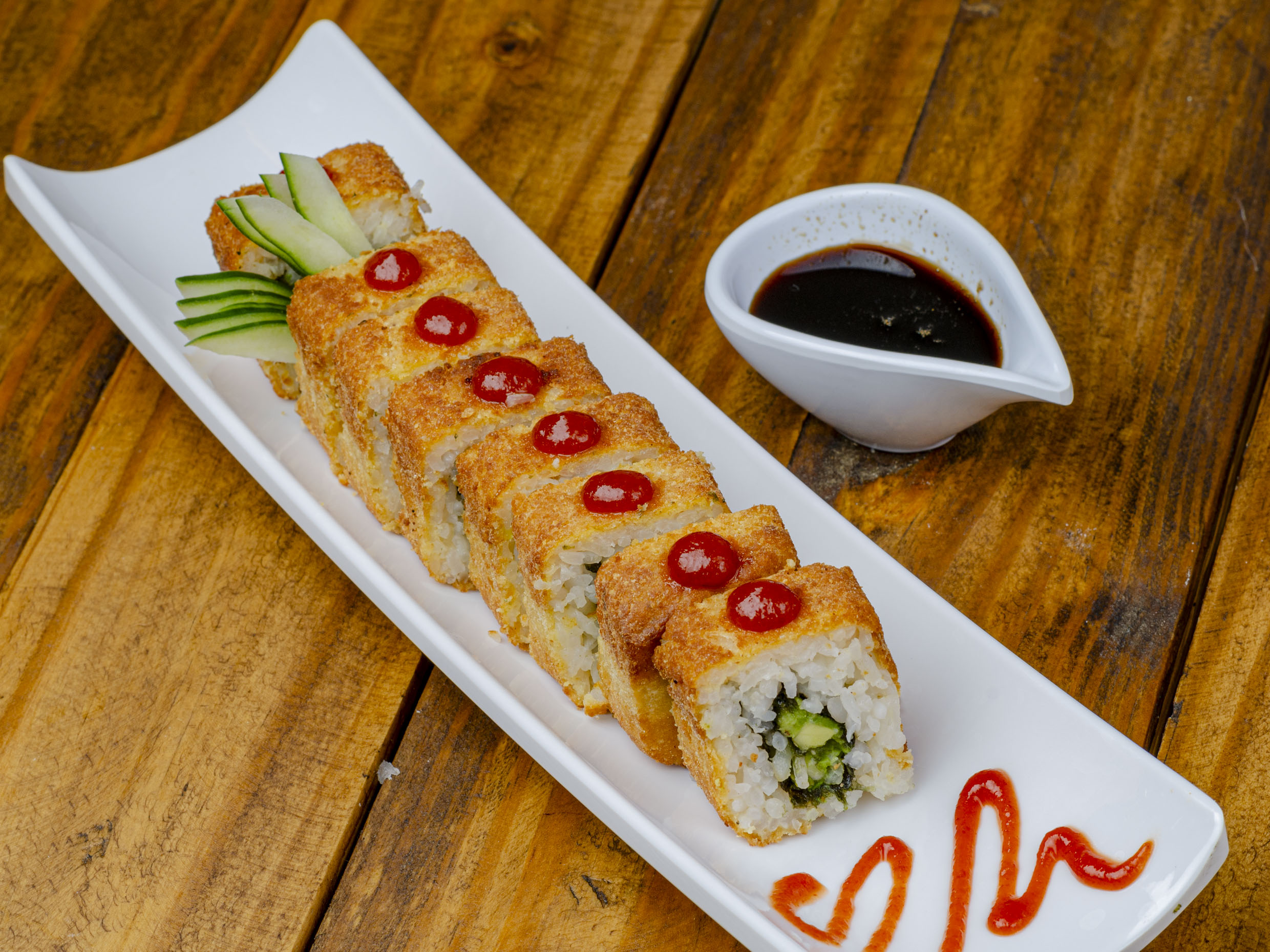 Preparado con camarón, cebollina, aguacate y Philadelphia, empanizado por fuera y terminado con gotas de salsa de siracha.