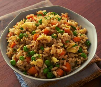 Arroz frito con huevo, zanahoria, calabaza y soya.