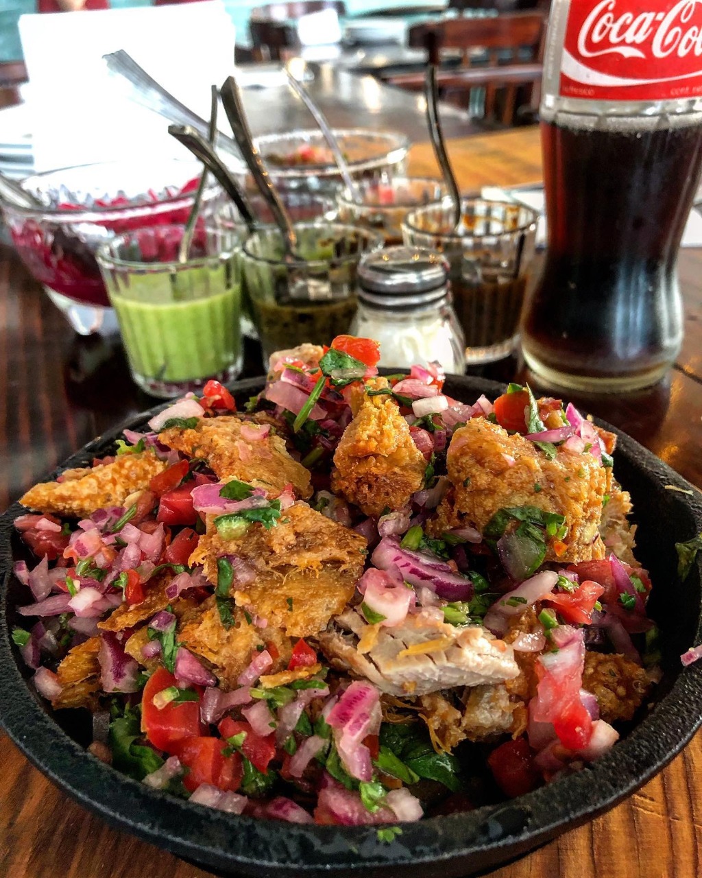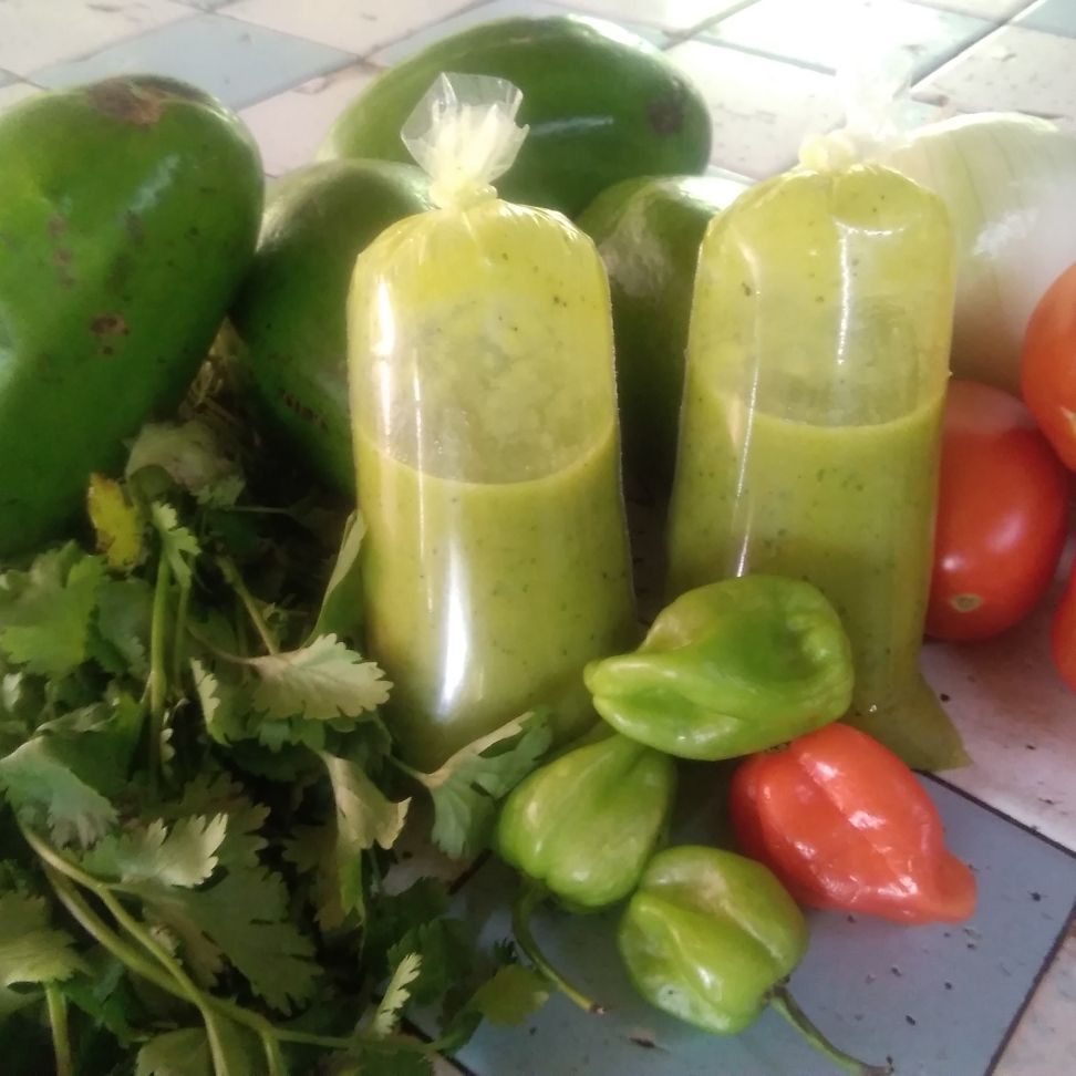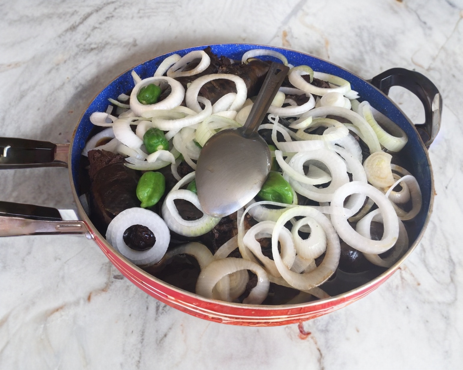 Tripa rellena de carne con sesos, hierba buena y cebollín, cebolla asada y chile habanero.