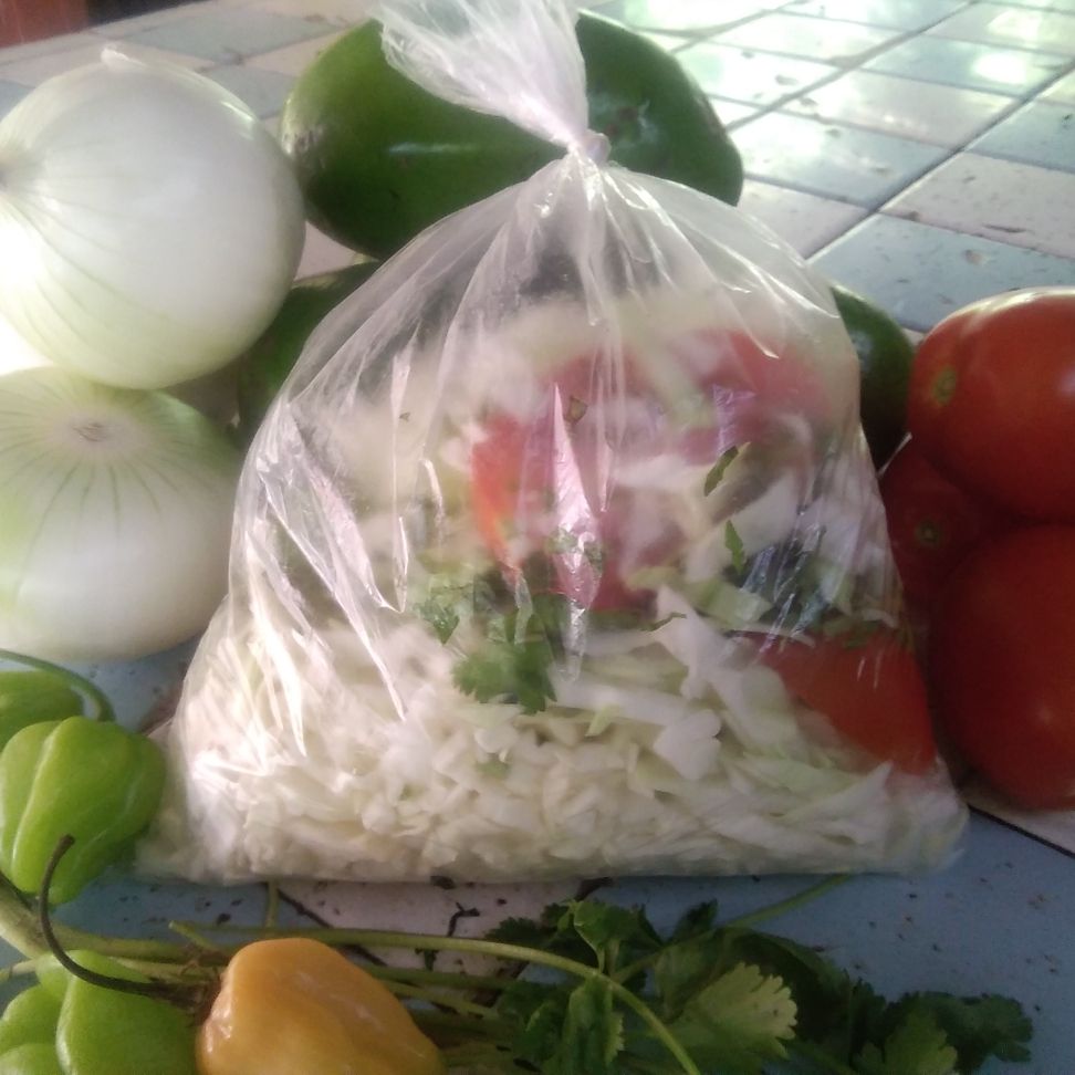 350 Gr de castacán, buche, maciza, entrecijo y cáscara con repollo, cebolla, tomate, cilantro con limón y/o naranja bien picado.
