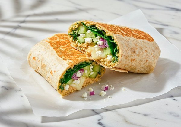 Wrap en tortilla de harina relleno con queso mozzarella, queso feta, pepino, cebolla morada, espinaca, hierbabuena y hummus.