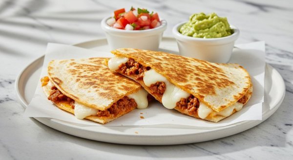 Sincronizada de tortilla de harina con chorizo molido y queso. Acompañada con pico de gallo y guacamole aparte.