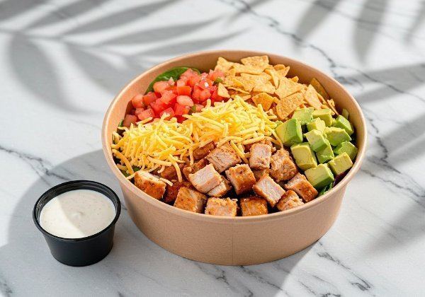 Ensalada a base de lechuga con pollo en cubos, queso cheddar, pico de gallo, aguacate, totopos triturados y aderezo a elección. El tamaño perfecto para que la acompañes con una sopa o wrap.
