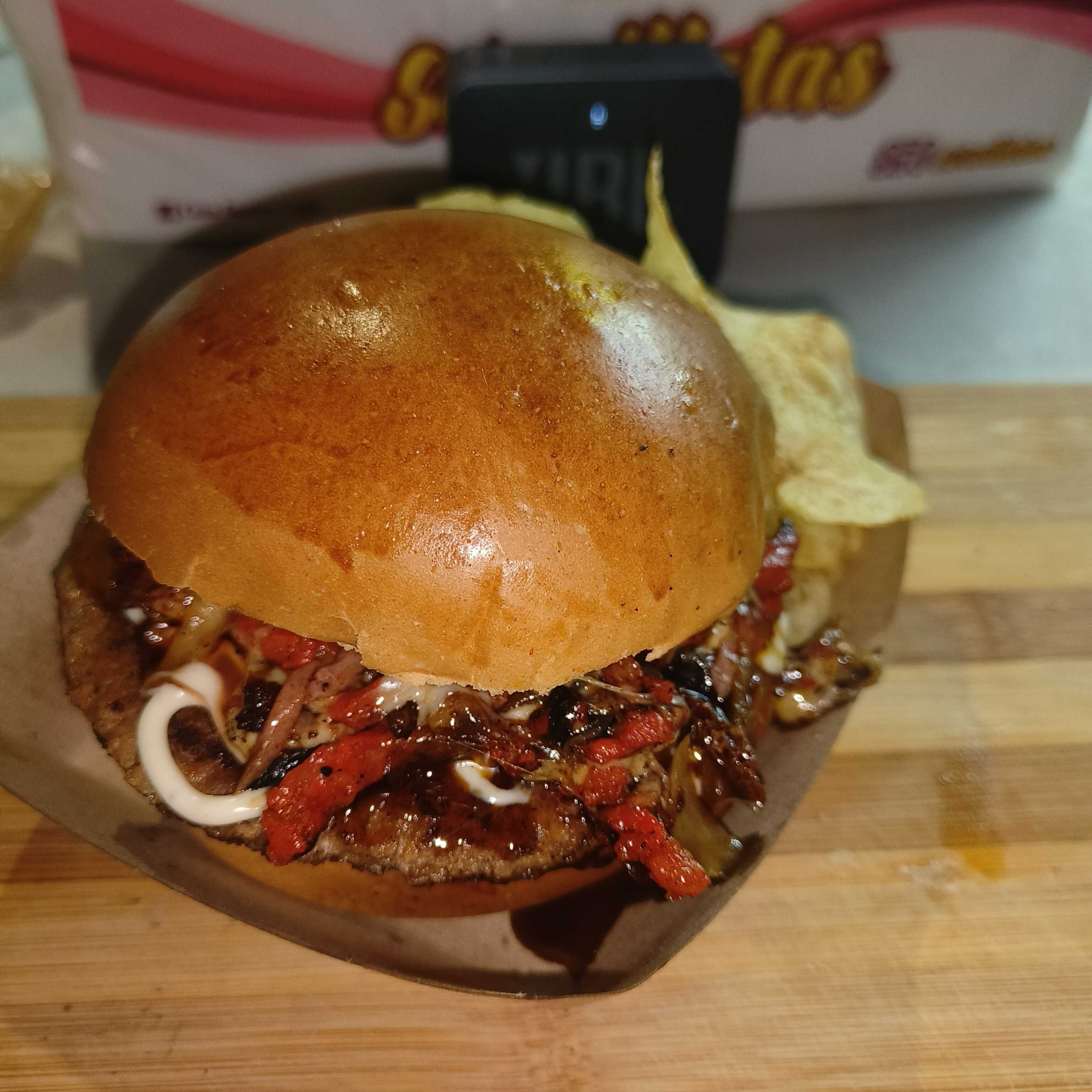 Pan de hamburguesa broche carne jamón queso tocino picado y queso de bola