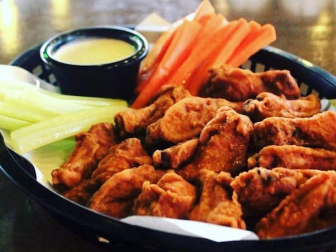 30 alitas bañadas de tus salsas favoritas, acompañadas de salsa ranch y zanahorias.