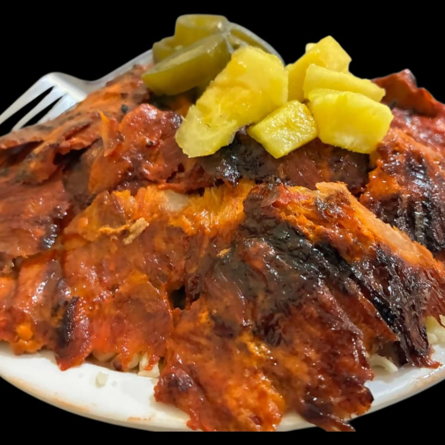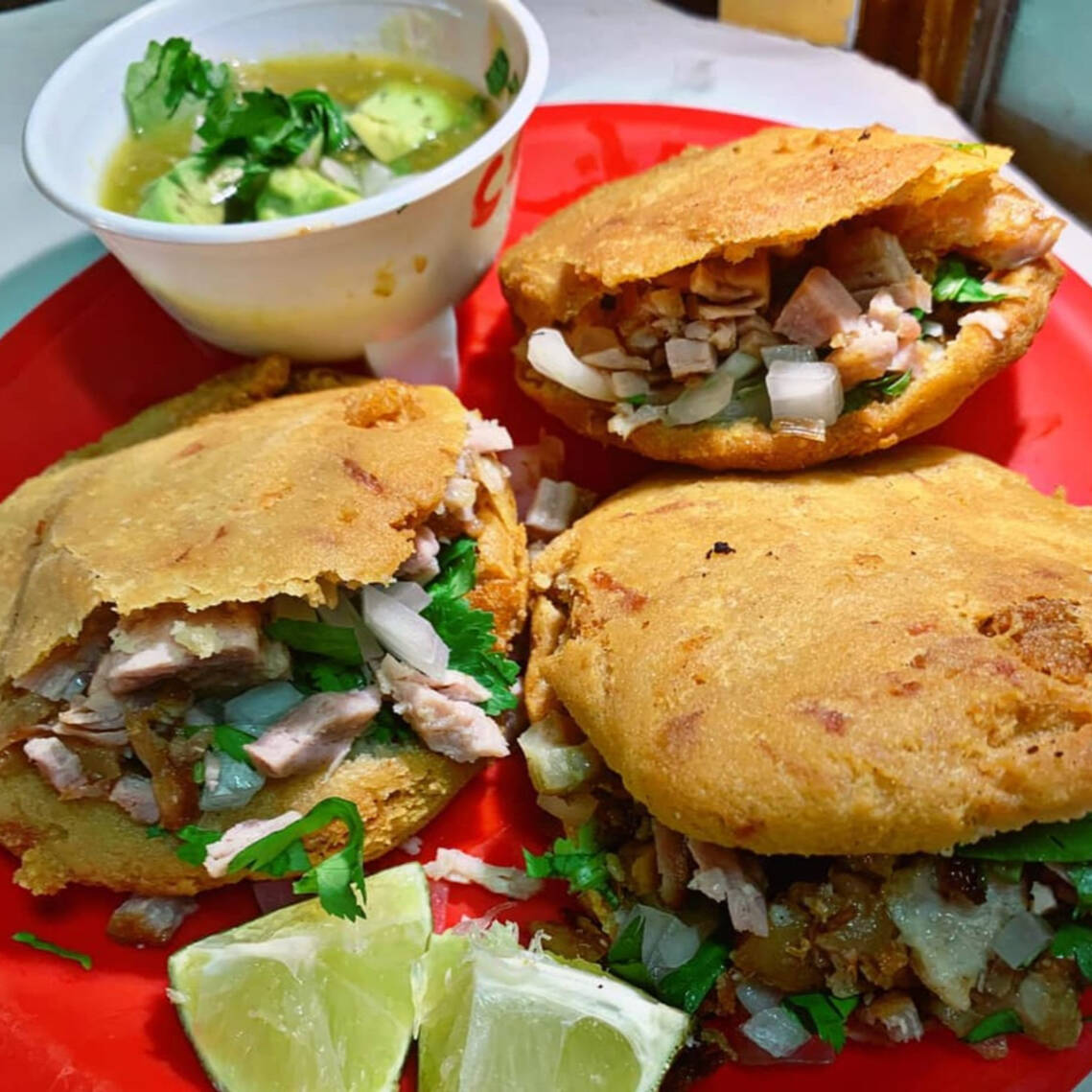tortilla dorada bañada con frijol cubiertas de carne marinada y queso gratinado