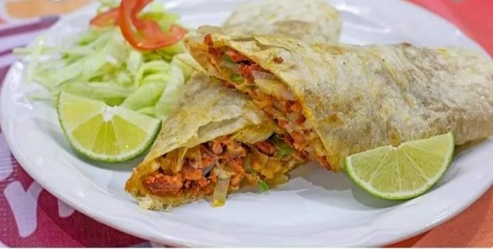 Tortilla de harina de 30 cm con frijol, queso y carne al pastor.