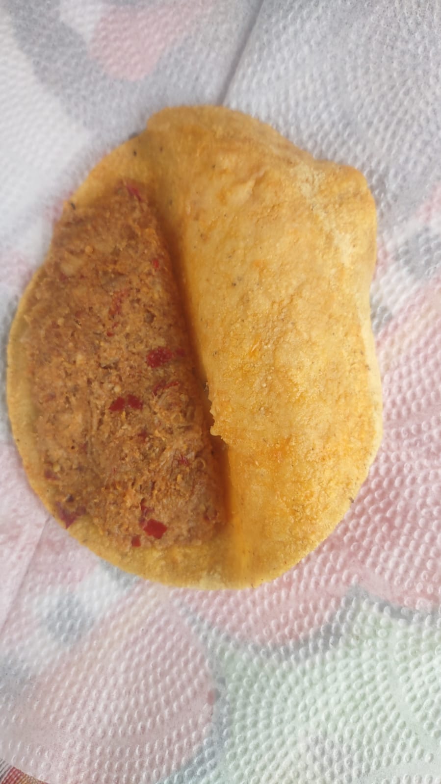Delicioso taco de maíz de chicharrón prensado en salsa roja (chile guajillo, morita y tomate verde) acompañado de cebolla frita y salsa de tomate verde con chile serrano.