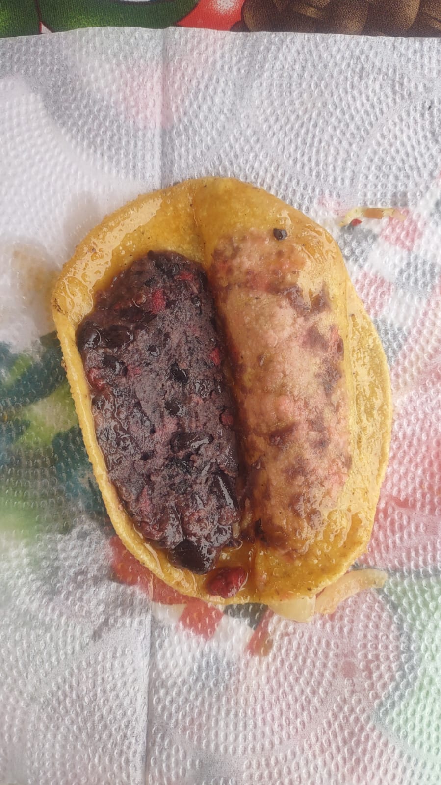 Delicioso taco de maíz con frijol con chorizo acompañado de cebolla frita y salsa de tomate verde con chile serrano.