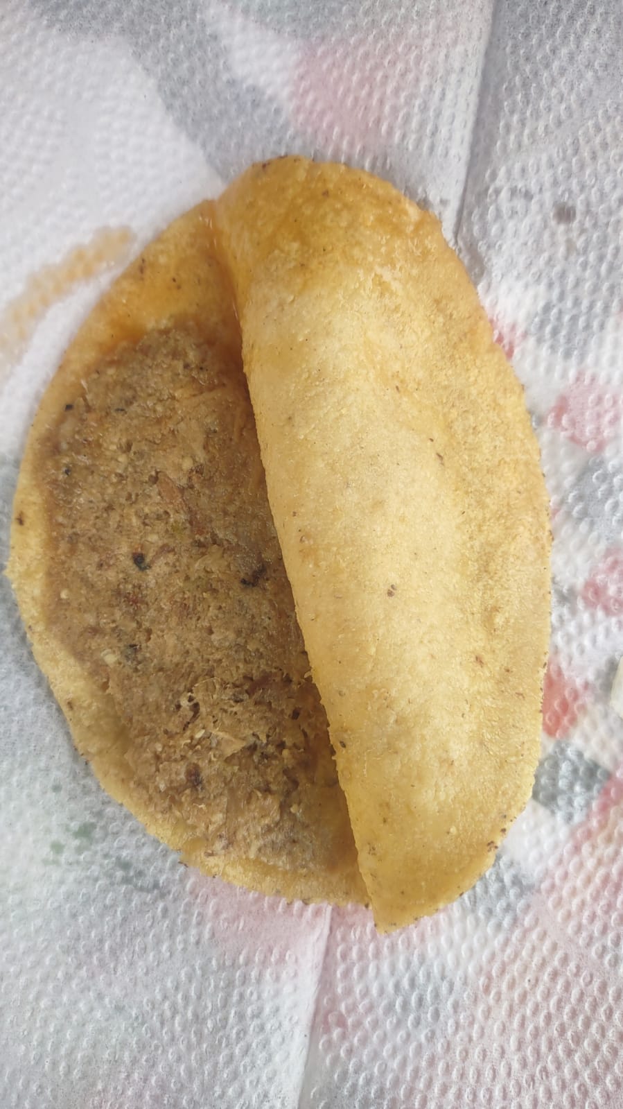 Delicioso taco de maíz de chicharrón prensado en salsa verde (chile serrano y tomate verde) acompañado de cebolla frita y salsa de tomate verde con chile serrano.