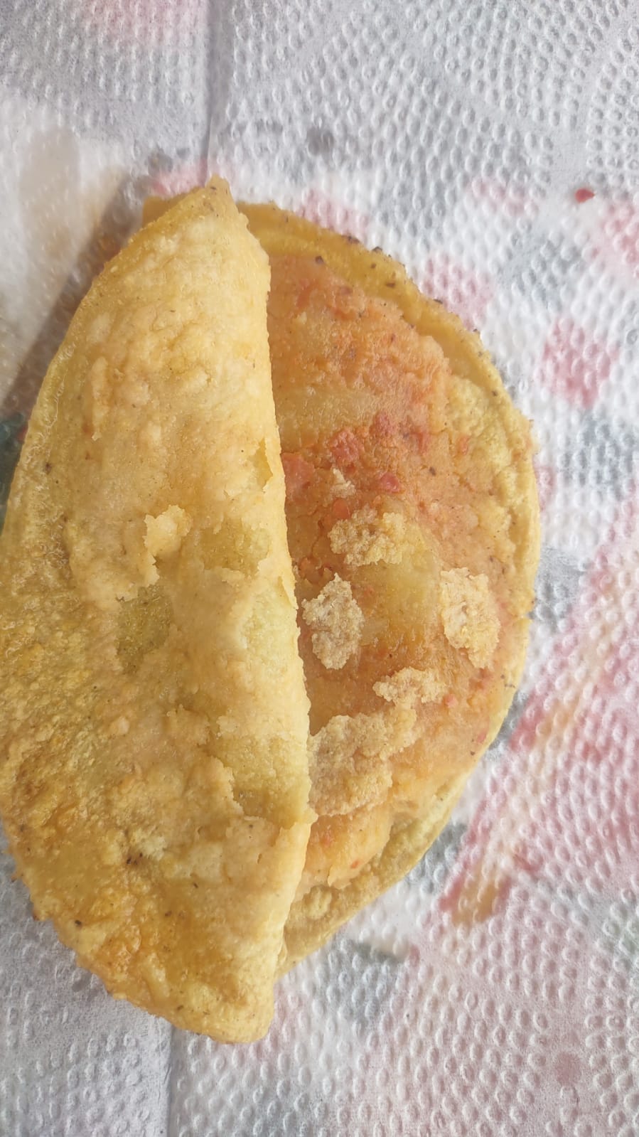 Delicioso taco de maíz de papa natural con longaniza acompañado de cebolla frita y salsa de tomate verde con chile serrano.