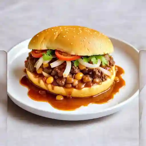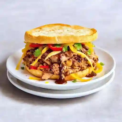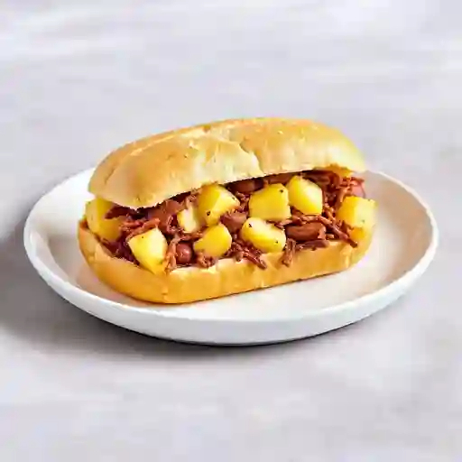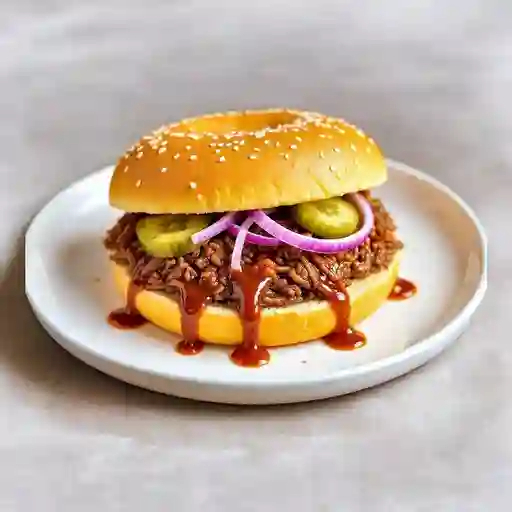 Pan tostado con carne deshebrada bañada en salsa barbacoa, cebolla morada y pepinillos.