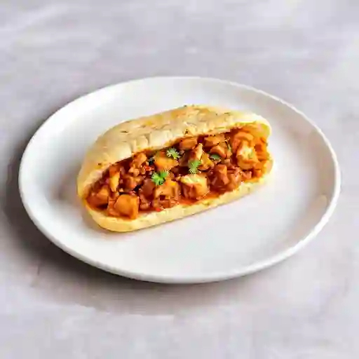 Torta rellena de pollo deshebrado, bañada en salsa de mole rojo.
