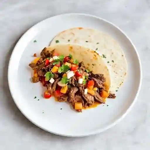 Taco con bistec de res cortado en tiras, cocinado a la mexicana con tomate, cebolla y chile serrano, servido en tortilla.