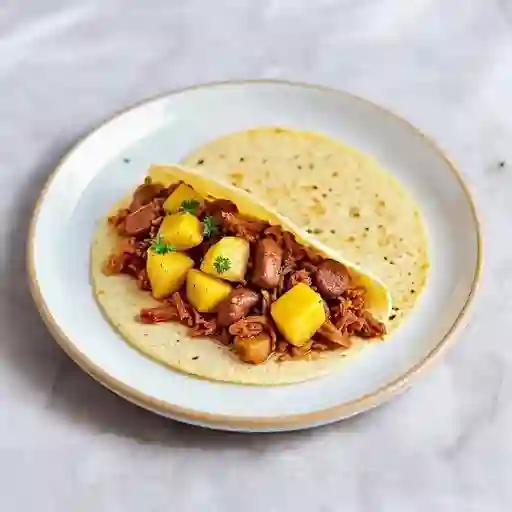 Taco relleno de longaniza desmenuzada y trozos de papa guisada, servido en tortilla de maíz.