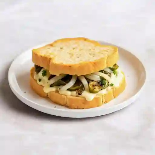 Torta rellena con tiras de chile poblano asado y cebolla, bañada en una salsa cremosa.