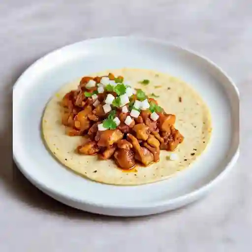 Carne de cerdo marinada en adobo de chile rojo, servida en tortilla con cebolla y cilantro.