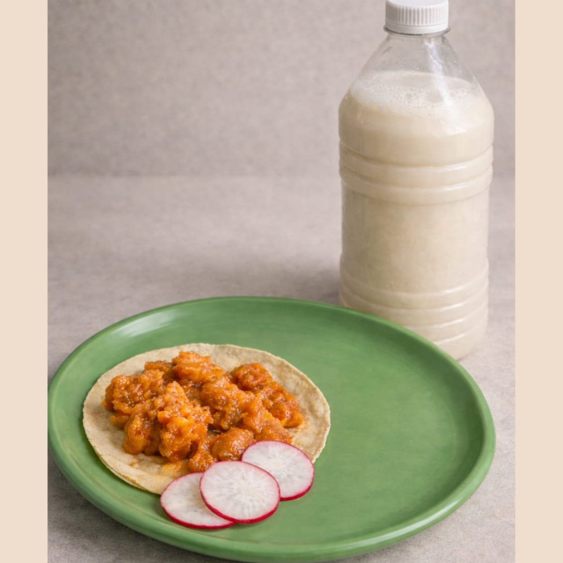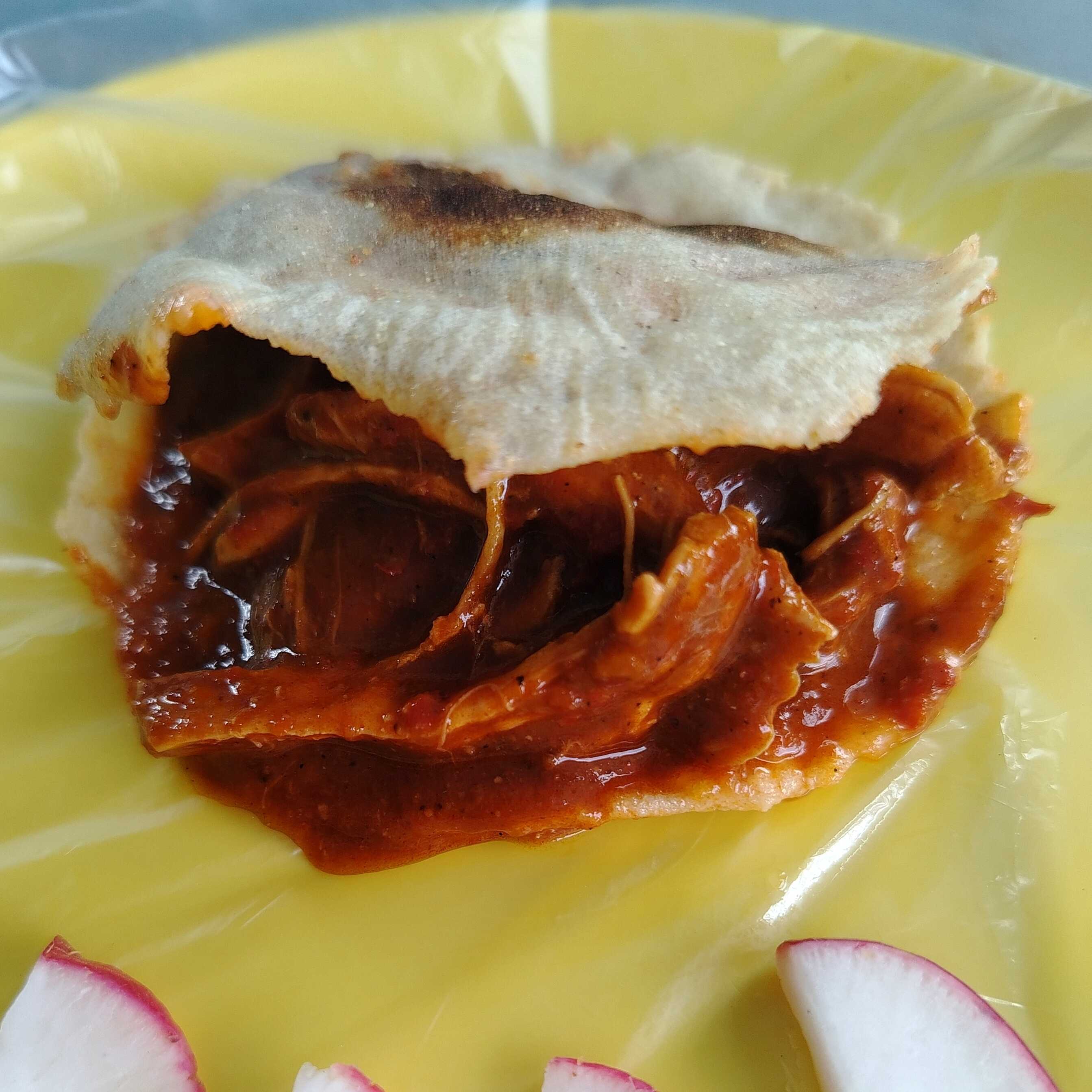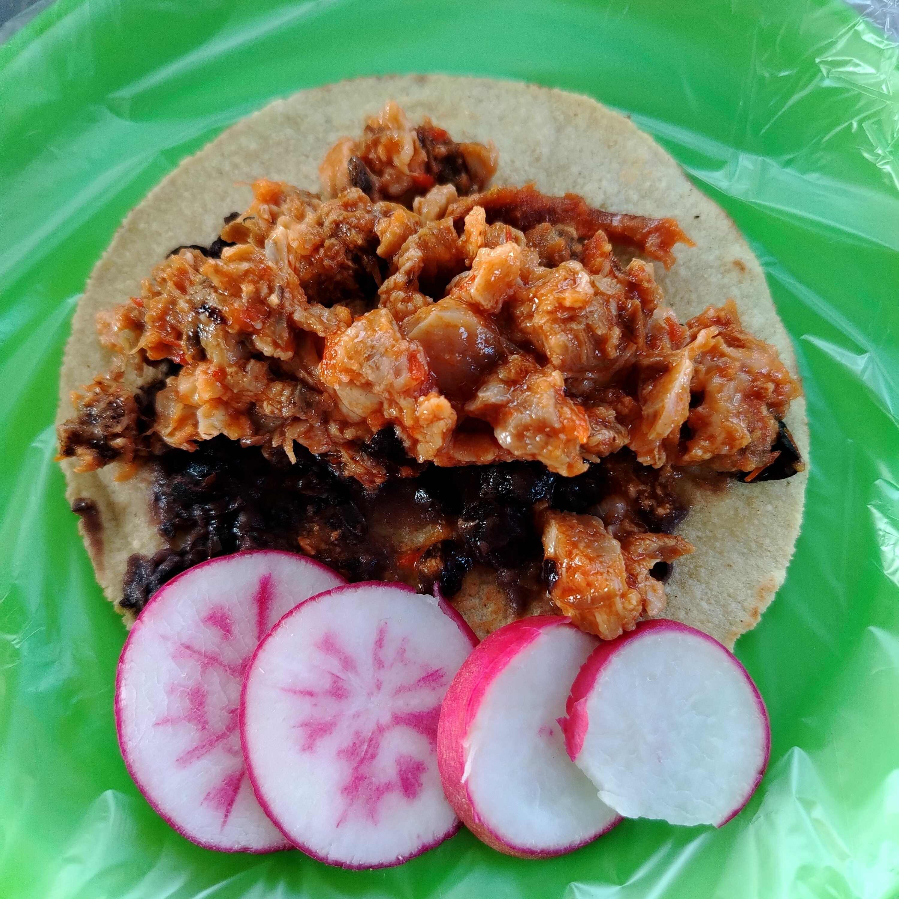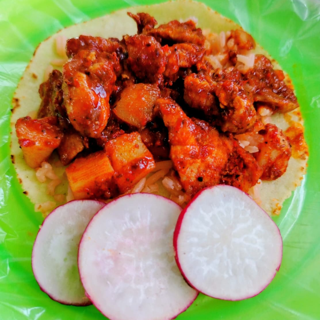 Taco de tortilla hecha a mano con carne de cerdo en salsa de chile guajillo; acompañado de arroz, frijol, rábanos y salsa picante