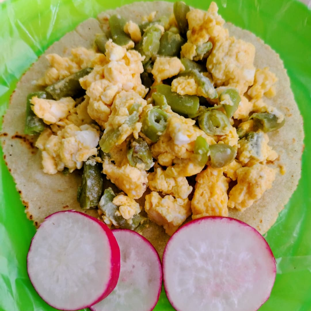 Taco de tortilla hecha a mano con huevo y ejote; acompañado de arroz, frijol, rábanos y salsa picante