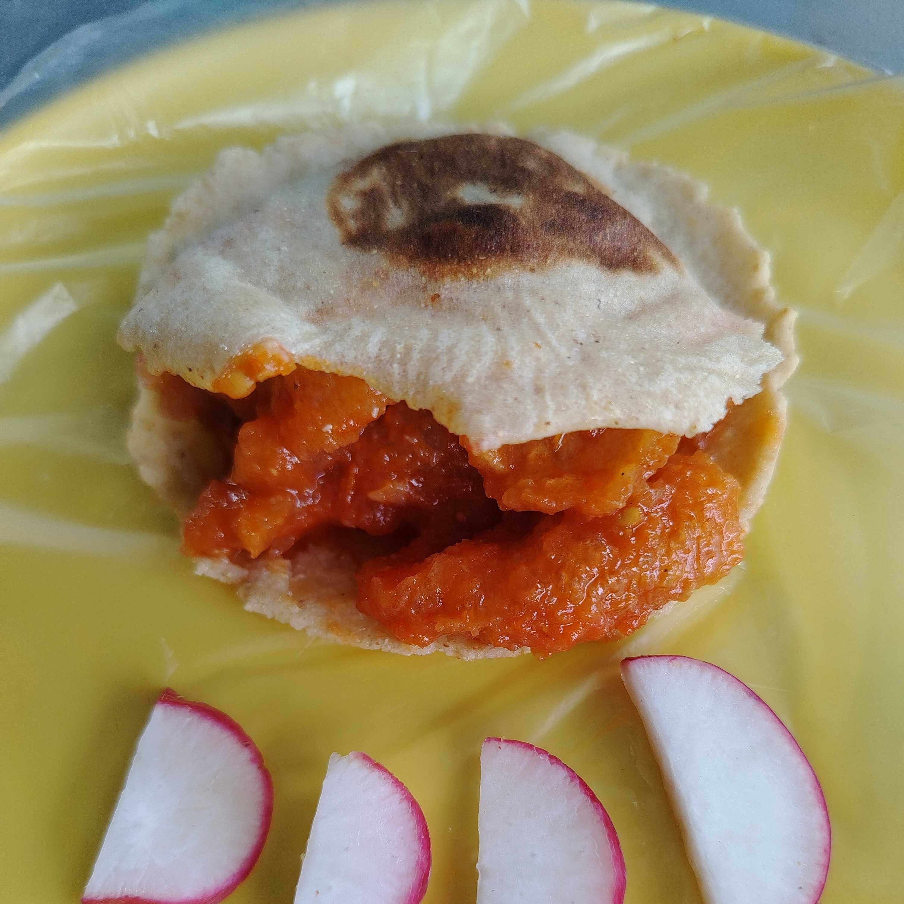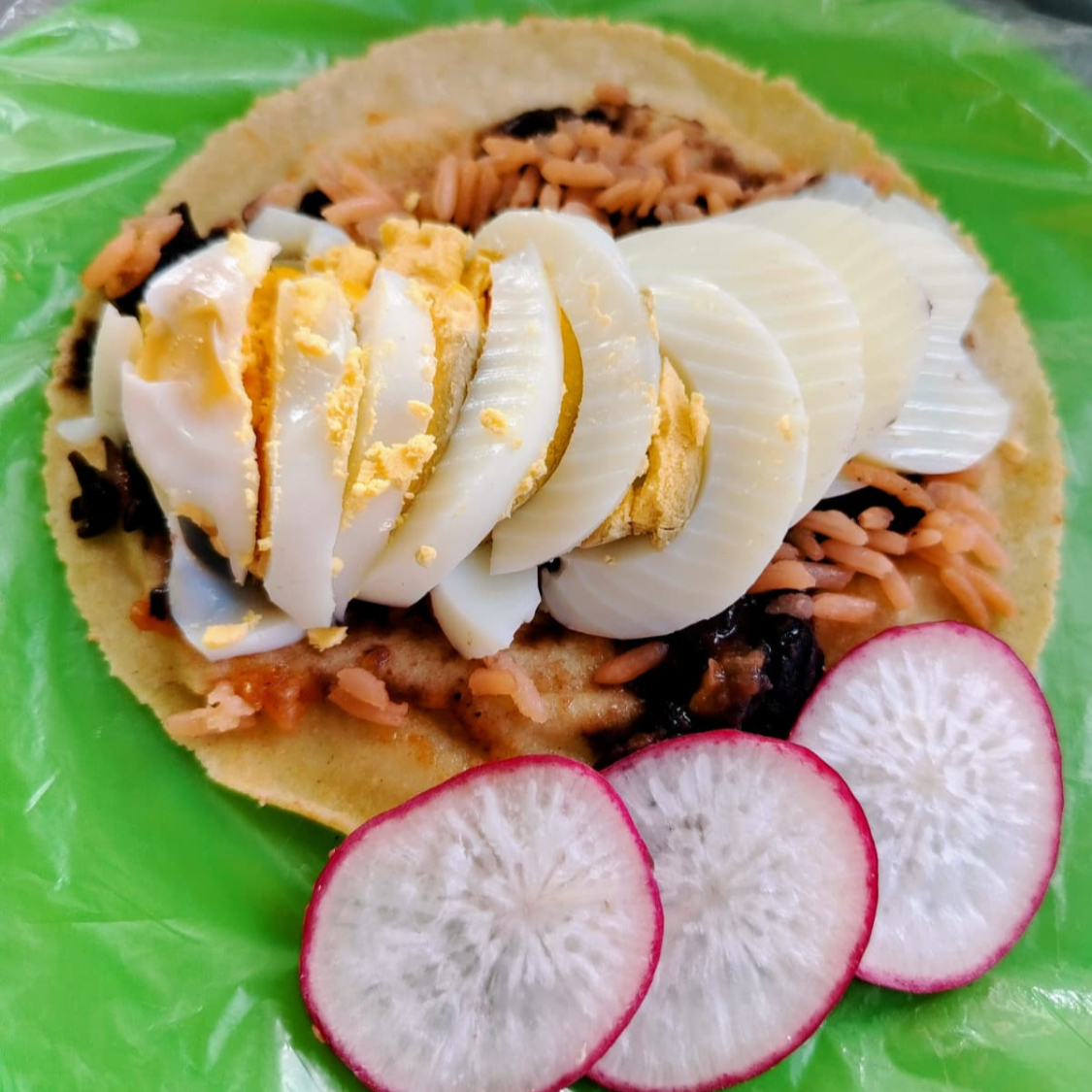 Taco de tortilla hecha a mano con huevo hervido; acompañado de arroz, frijol, rábanos y salsa picante