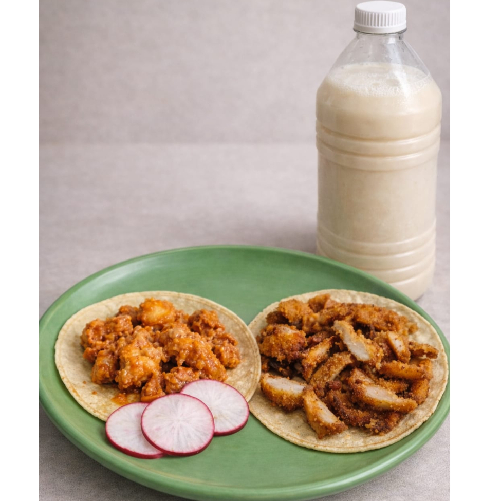 Taco de Chicharrón en Salsa Roja*3 + Taco de Empanizado de Pollo*2 + AGUA DE HORCHATA 1 L*1