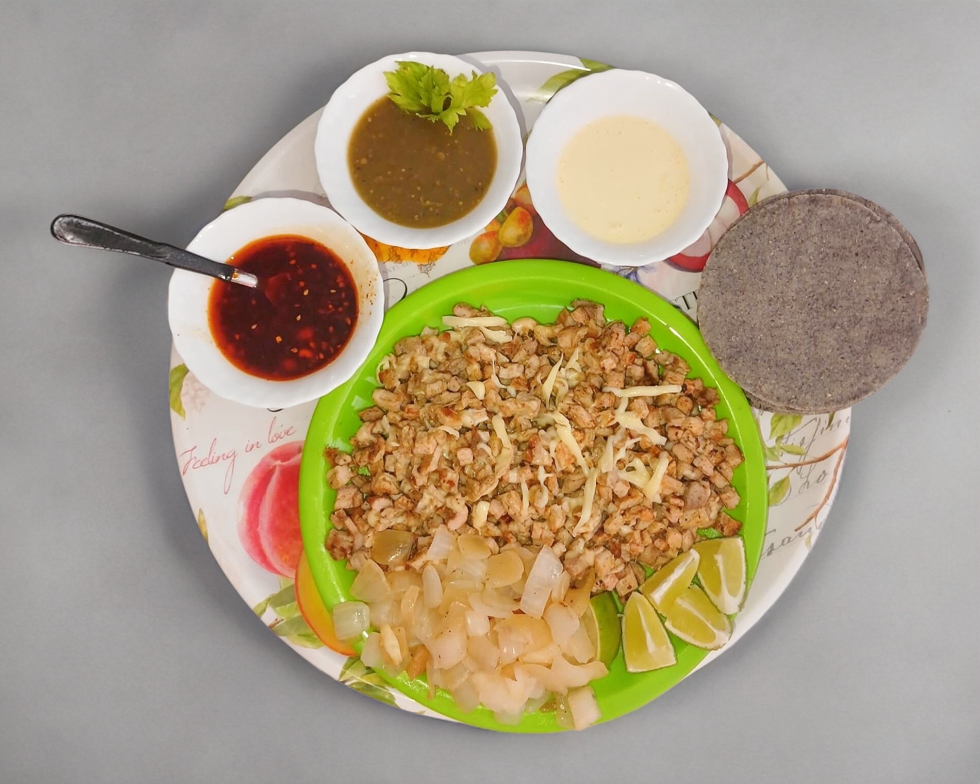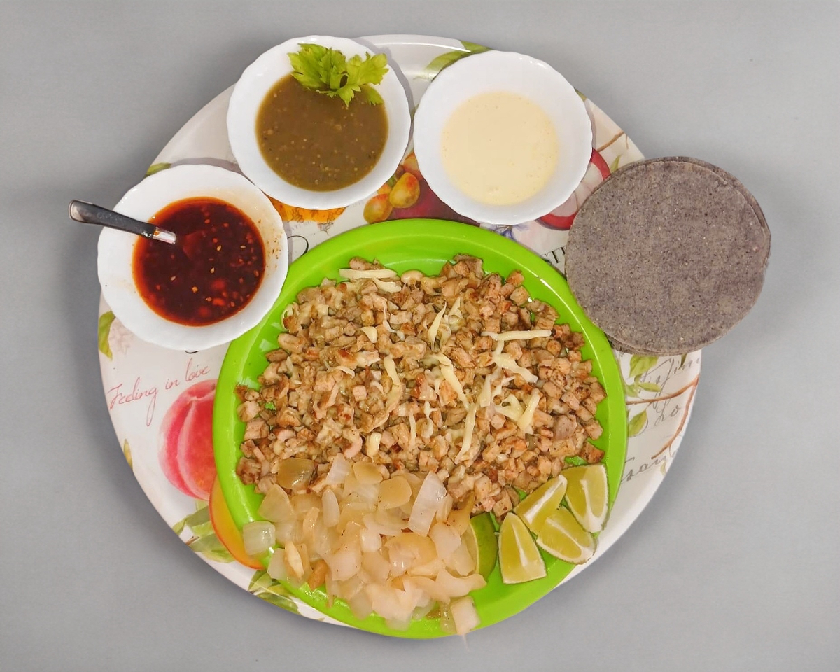 Para los verdaderos amantes de la carne de cerdo, nuestro 1 Kilo con Queso ofrece una abundante porción de carne sazonada a la perfección, acompañada de queso derretido. Ideal para compartir o disfrutar en grande, esta opción incluye cebolla caramelizada, salsa verde, crema de ajo y un toque de habanero picante.