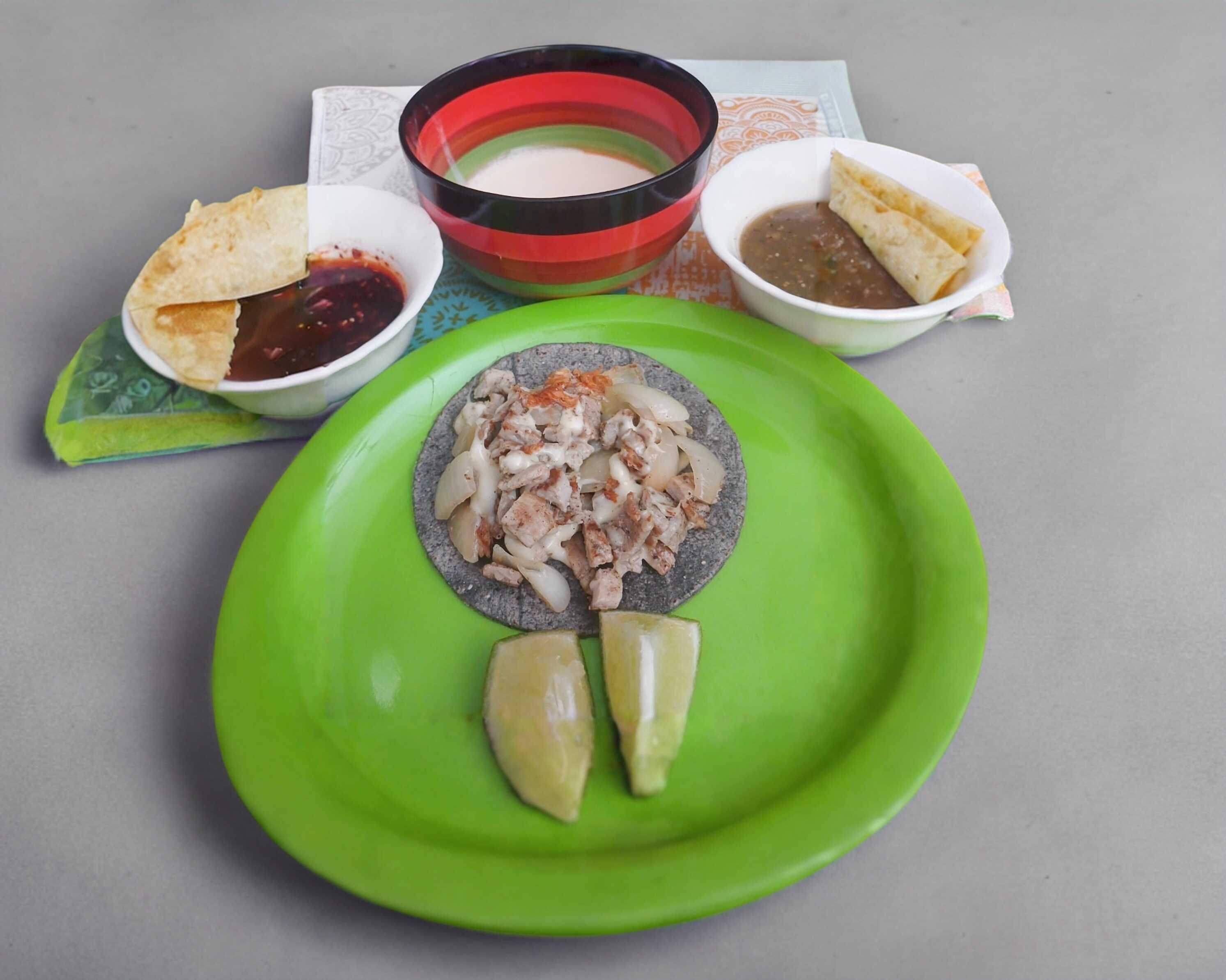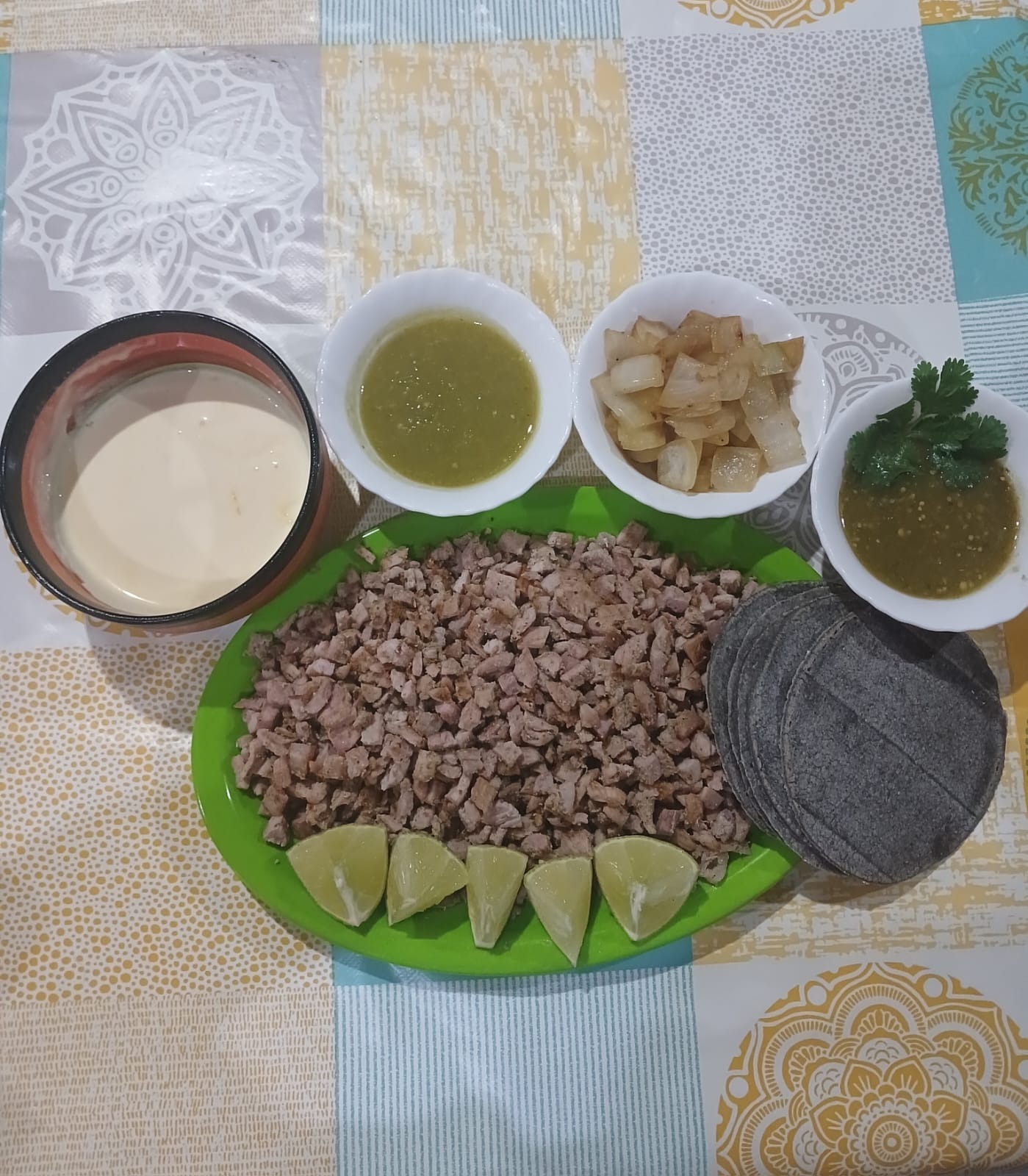 Disfruta de nuestro 1/4 kilo de carne de cerdo, una porción de carne jugosa y perfectamente sazonada. acompañada de cebolla caramelizada, salsa verde, crema de ajo y un toque picante de habanero.