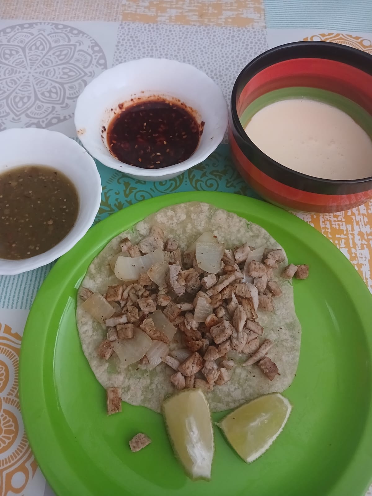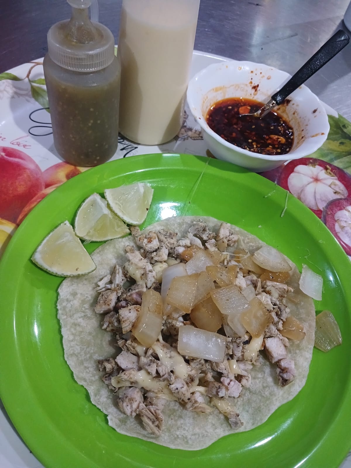 Tortilla de maíz con carne de pollo, cebolla caramelizada, salsa verde, crema de ajo y habanero picante, 1 pz.