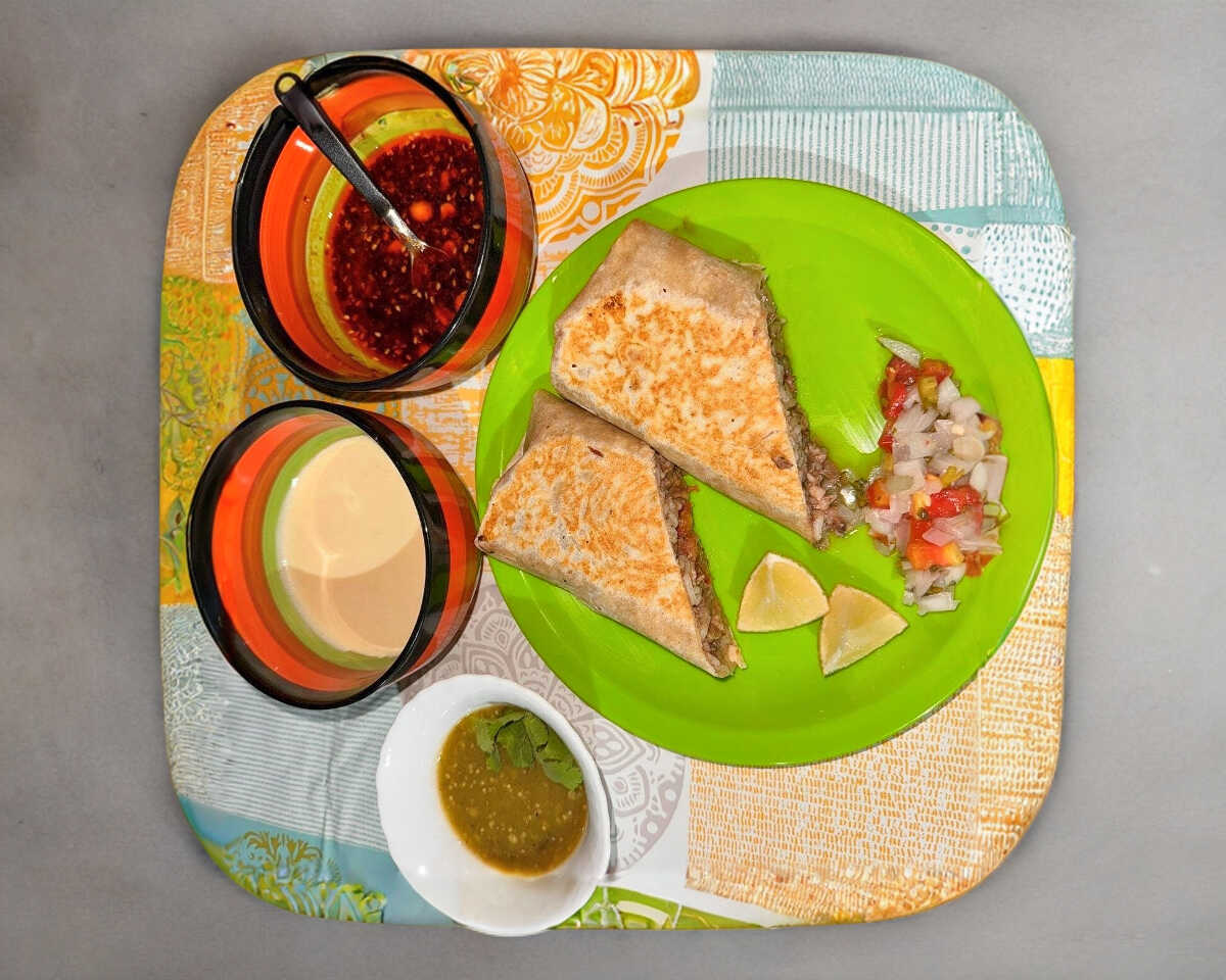 Tortilla de harina con carne, queso, cebolla caramelizada, salsa verde, crema de ajo y habanero picante, 1 pz.
