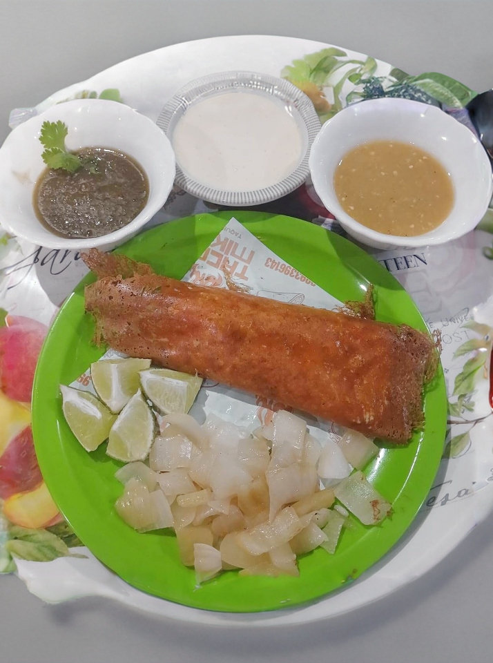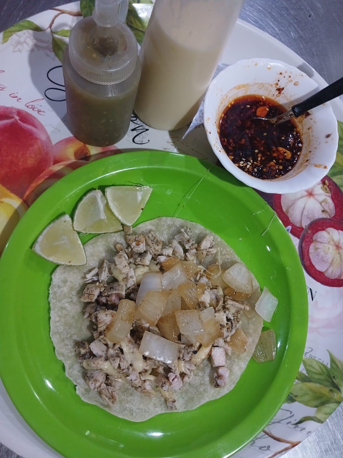 Tortilla de harina con carne de pollo, cebolla caramelizada, salsa verde, crema de ajo y habanero picante, 1 pz.