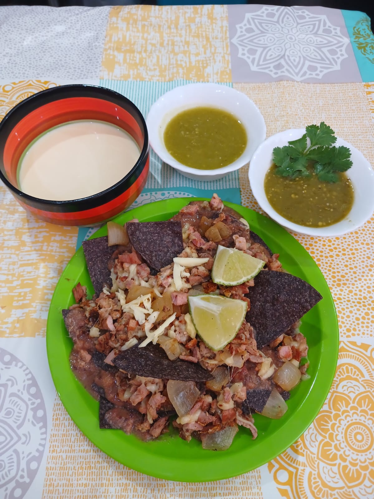 Disfruta de nuestros Mikenachos Medianos, una deliciosa combinación de totopos crujientes, frijoles refritos, carne jugosa y queso derretido, acompañados de cebolla asada, habanero y salsa de ajo.