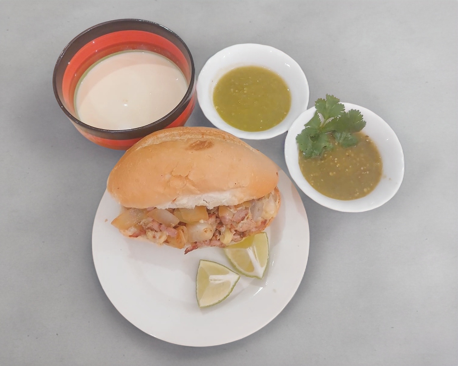 Torta especial de la casa con cebolla caramelizada, salsa verde, crema de ajo y habanero picante, 1 pz.