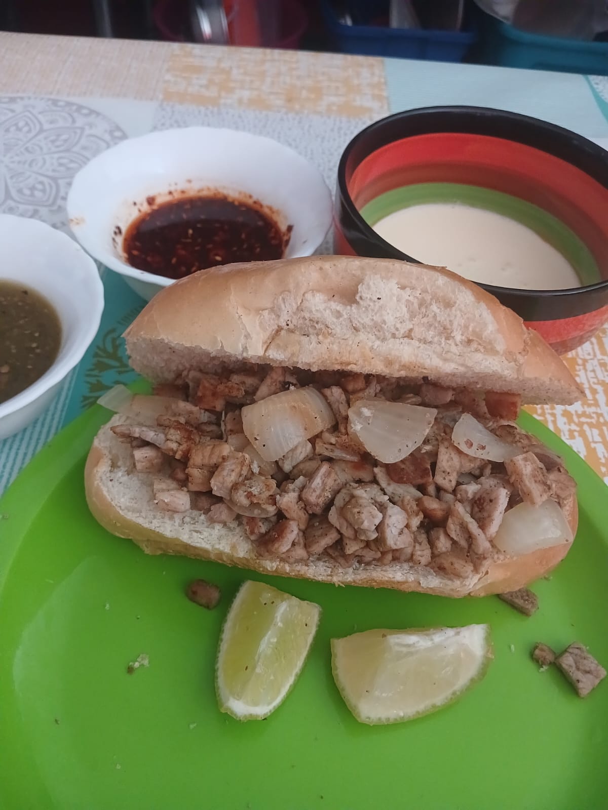 Prueba nuestro 1/2 kilo de carne de cerdo, una porción perfecta de carne jugosa y bien sazonada. incluye cebolla caramelizada, salsa verde, crema de ajo y un toque de habanero picante.