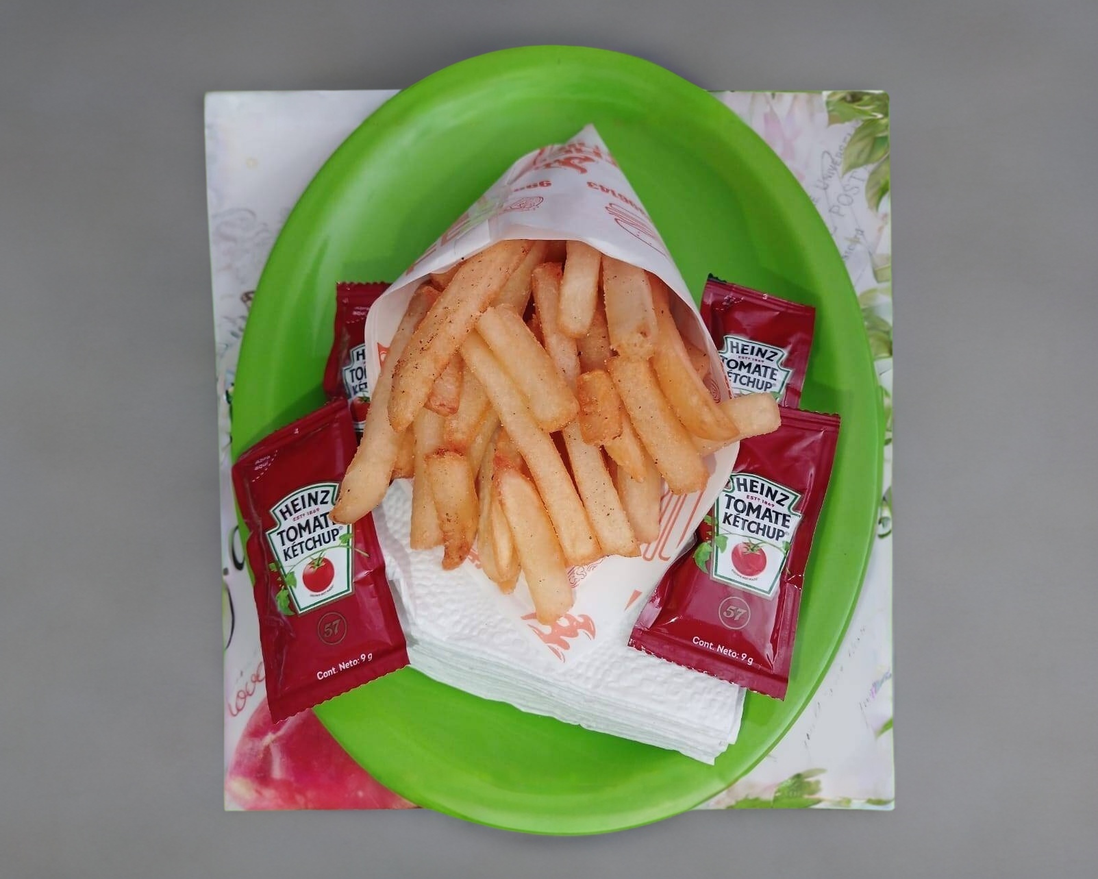 Crujientes papas fritas acompañadas de tu salsa favorita: kétchup, mayonesa.