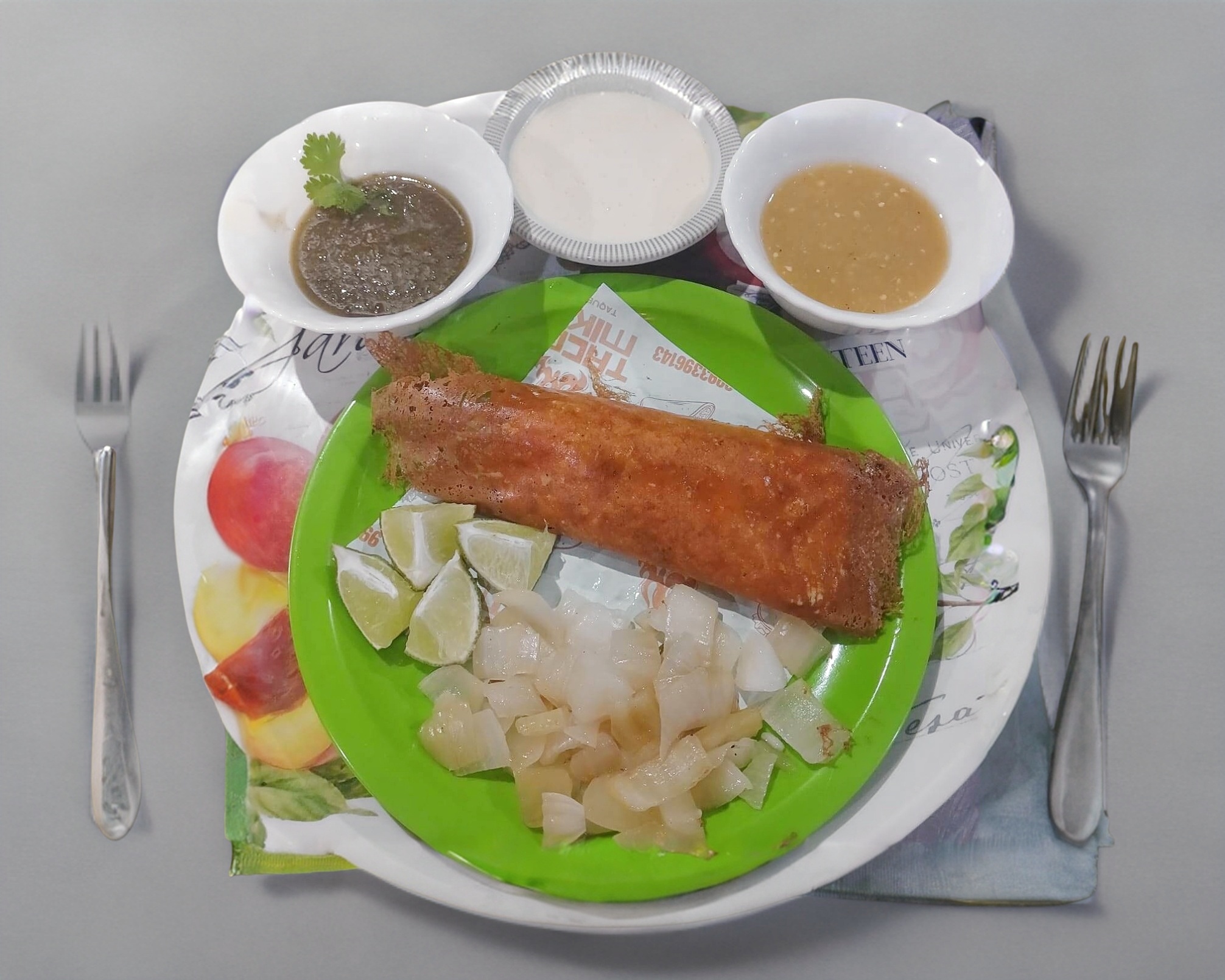 Carne árabe de res con papas a la francesa. Acompañado con Pico de Gallo, Crema de Ajo, Tomate Verde y Chile Habanero.
