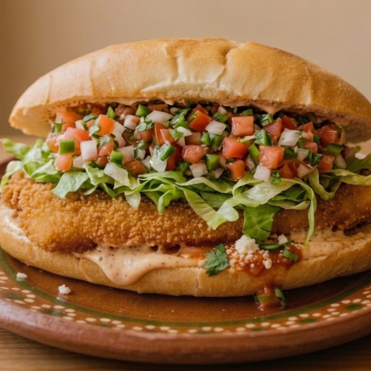 Torta especial de la casa con filete de pescado empanizado con lechuga, tomate y pico de gallo, salsa verde, crema de ajo, habanero picante y aderezo chipotle. 1 pz.