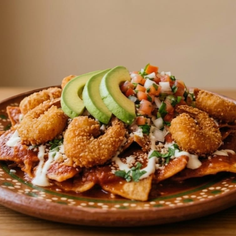 Deliciosos Chilaquiles con 7 camarones, lechuga, cebolla, aguacate, media crema y quesito.