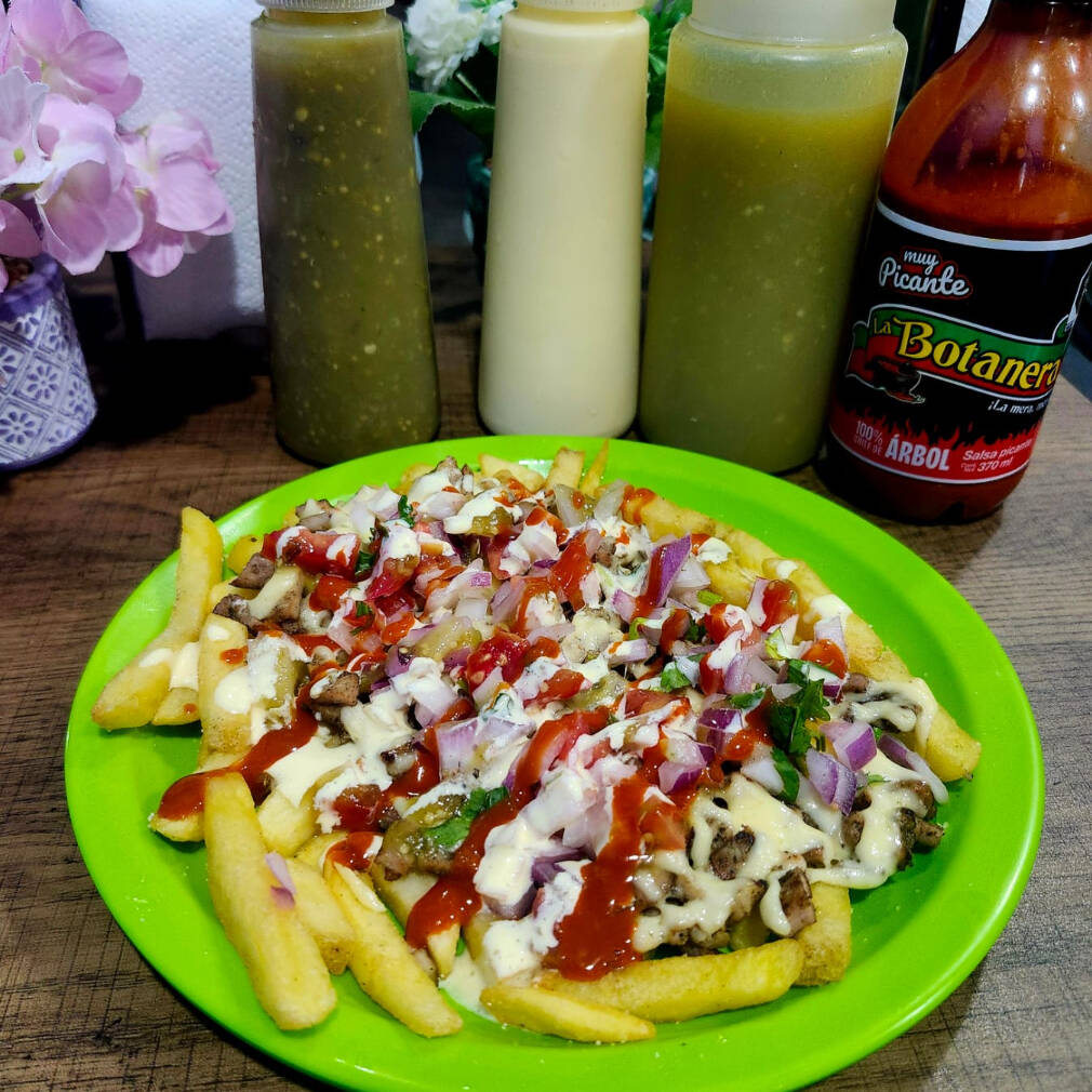 Carne árabe de res con queso y papas a la francesa. Acompañado con Pico de Gallo, Crema de Ajo, Tomate Verde y Chile Habanero.