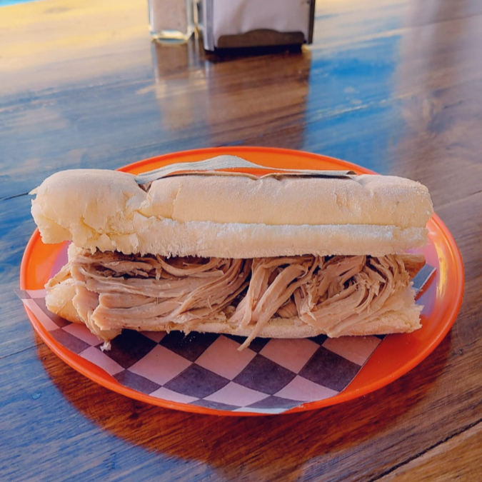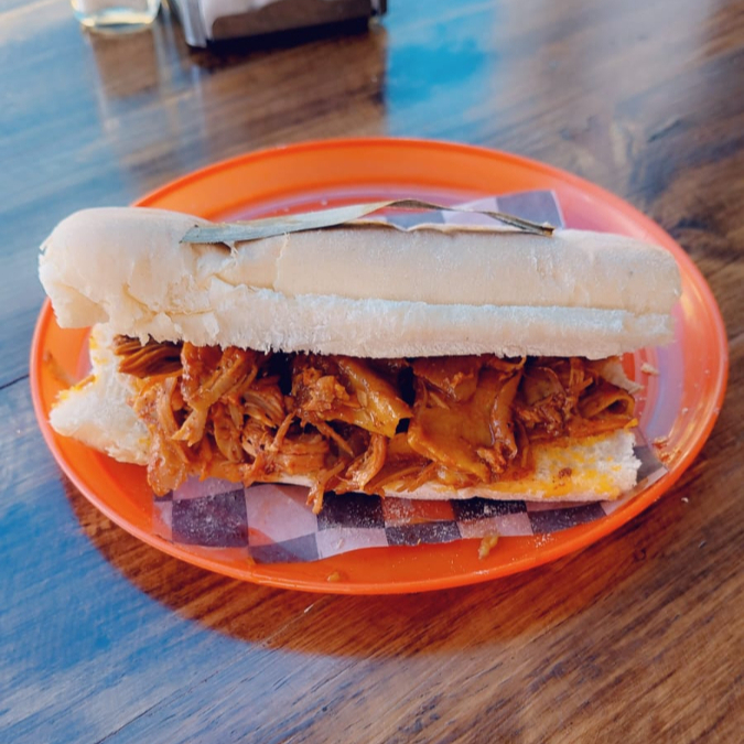 Pan artesanal relleno de carne al pastor rojo o árabe con complementos clásicos.