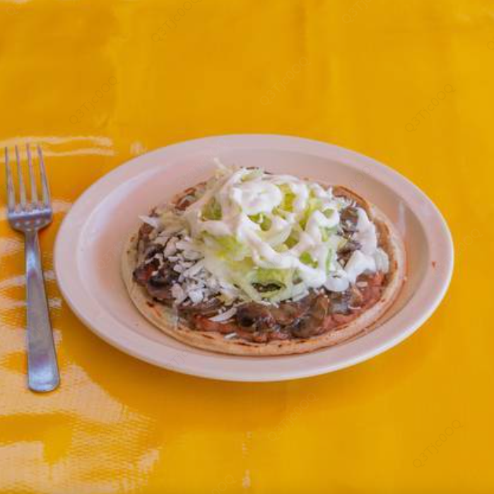 Tostada de maíz con frijoles, lechuga, queso, crema y salsas.