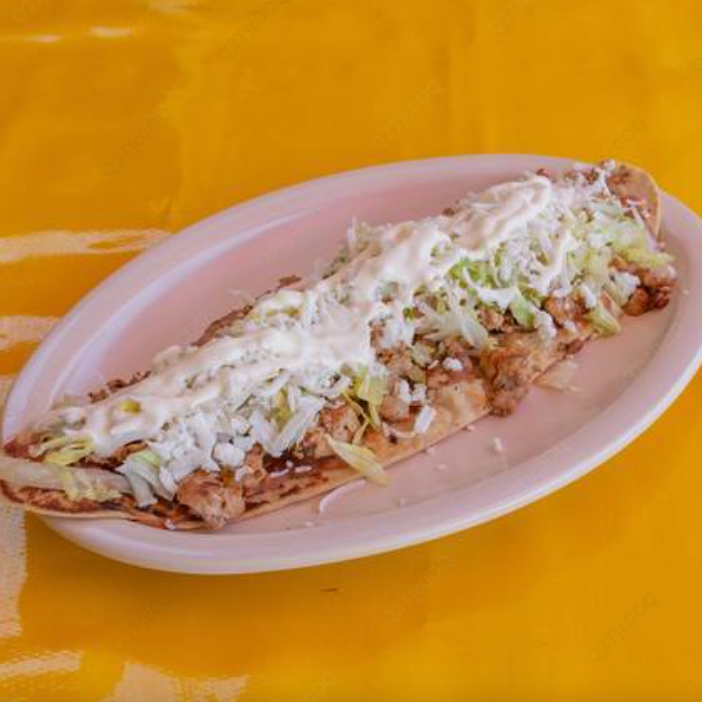 Huarache de masa de maíz con frijoles con carne o guiso de su elección acompañado de lechuga, queso, crema y salsa.