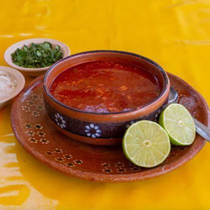 Caldo de birria con carne con cebolla, cilantro, salsa y tortillas.