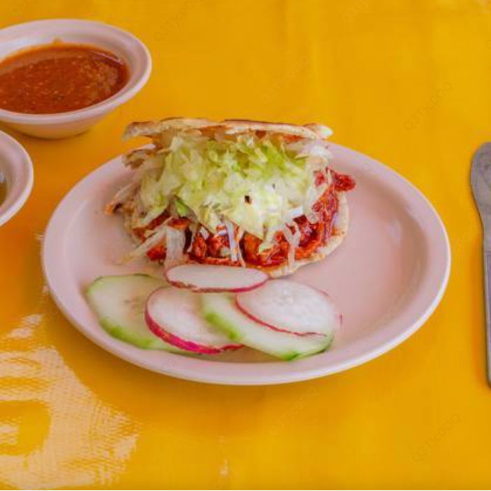 Gordita de masa de maíz a la plancha con una carne o guiso de su elección acompañadas de lechuga, queso, crema y salsa.